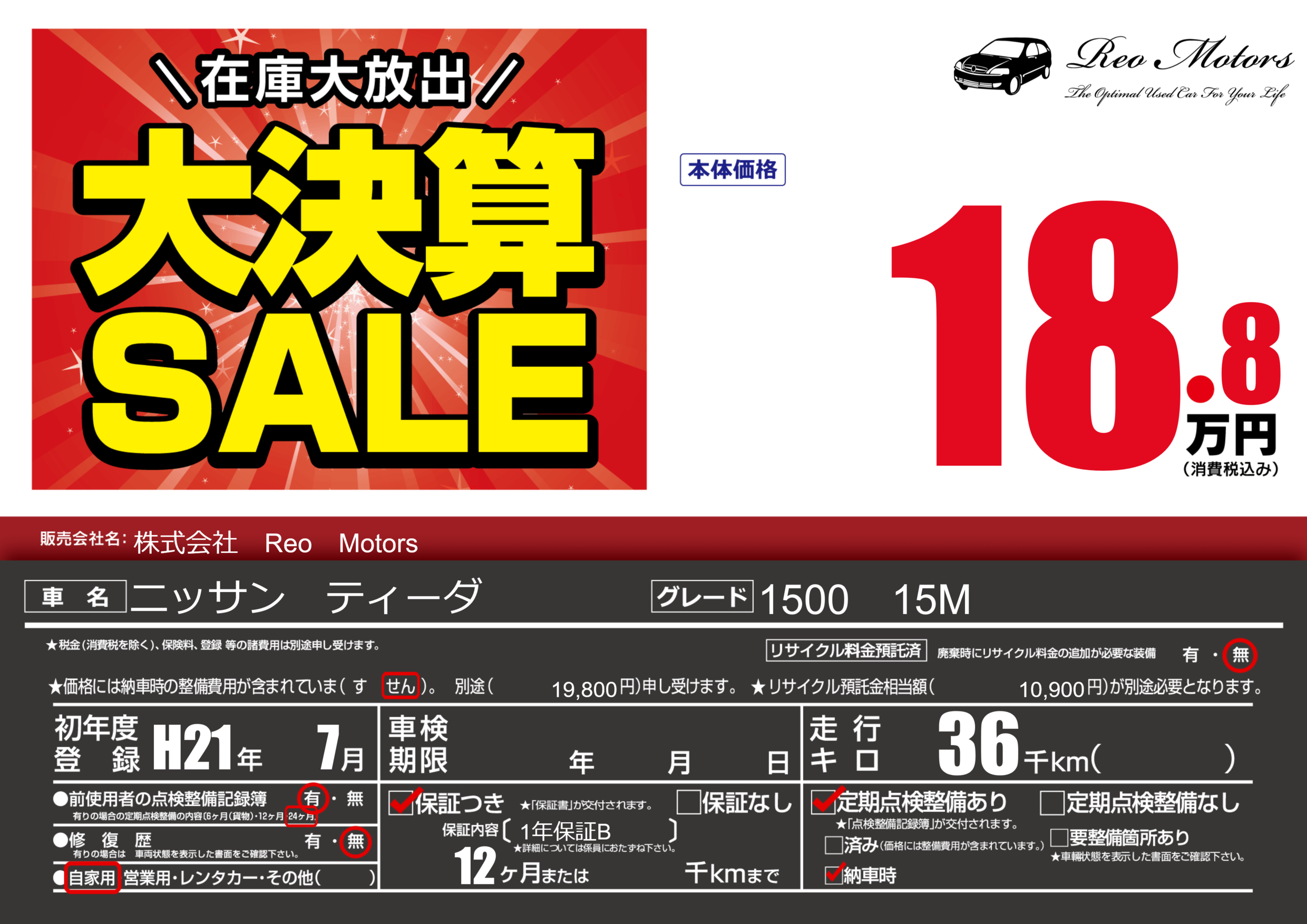 | 車名 | ニッサン ティーダ | グレード ミッション 排気量 |
