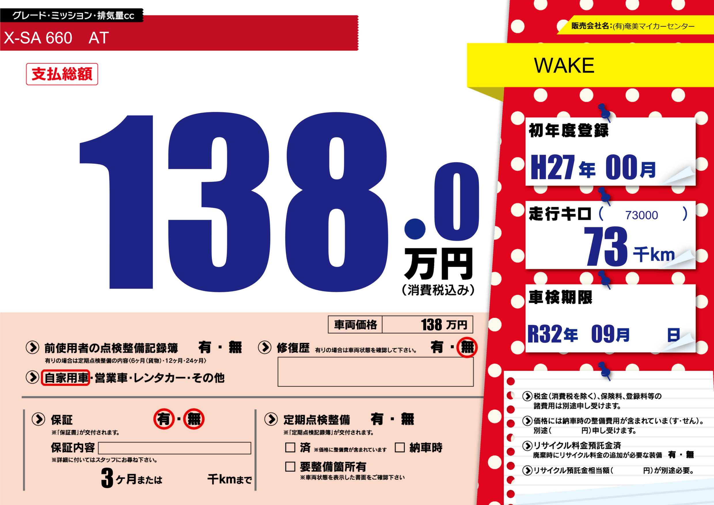 | 車名 | WAKE | グレード ミッション 排気量 |