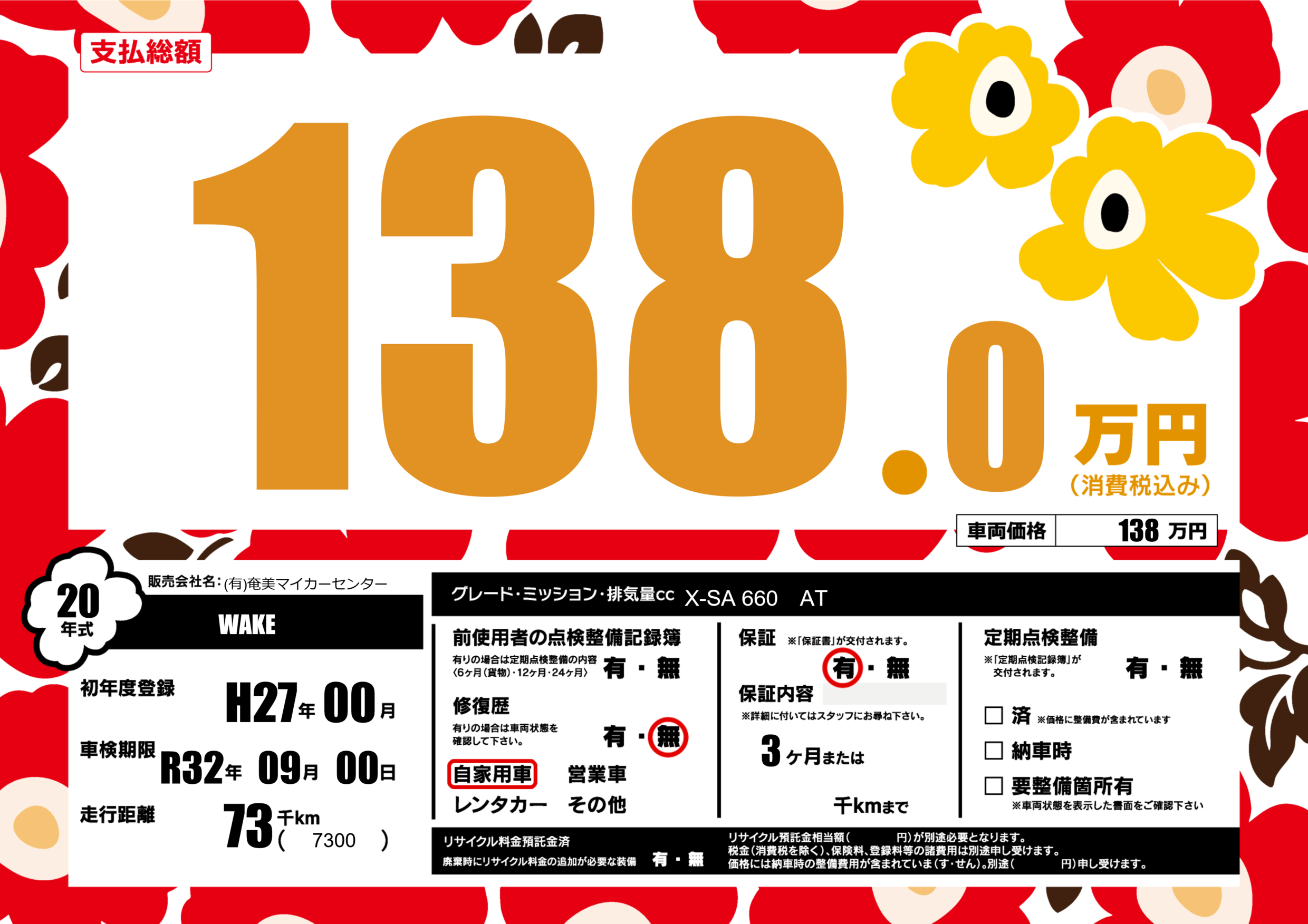 | 走行キロ | 7.3万km | 初年度登録 | H27年00月 |