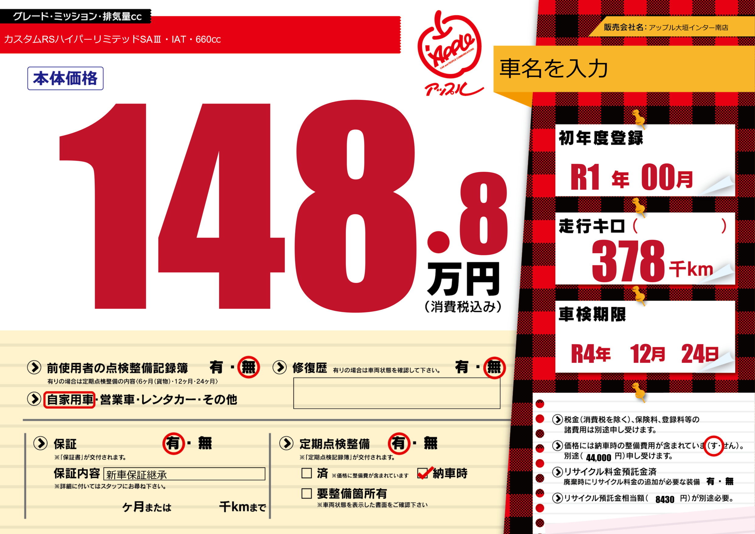 | 定期点検整備 | 定期点検整備あり 納車時あり | ||
