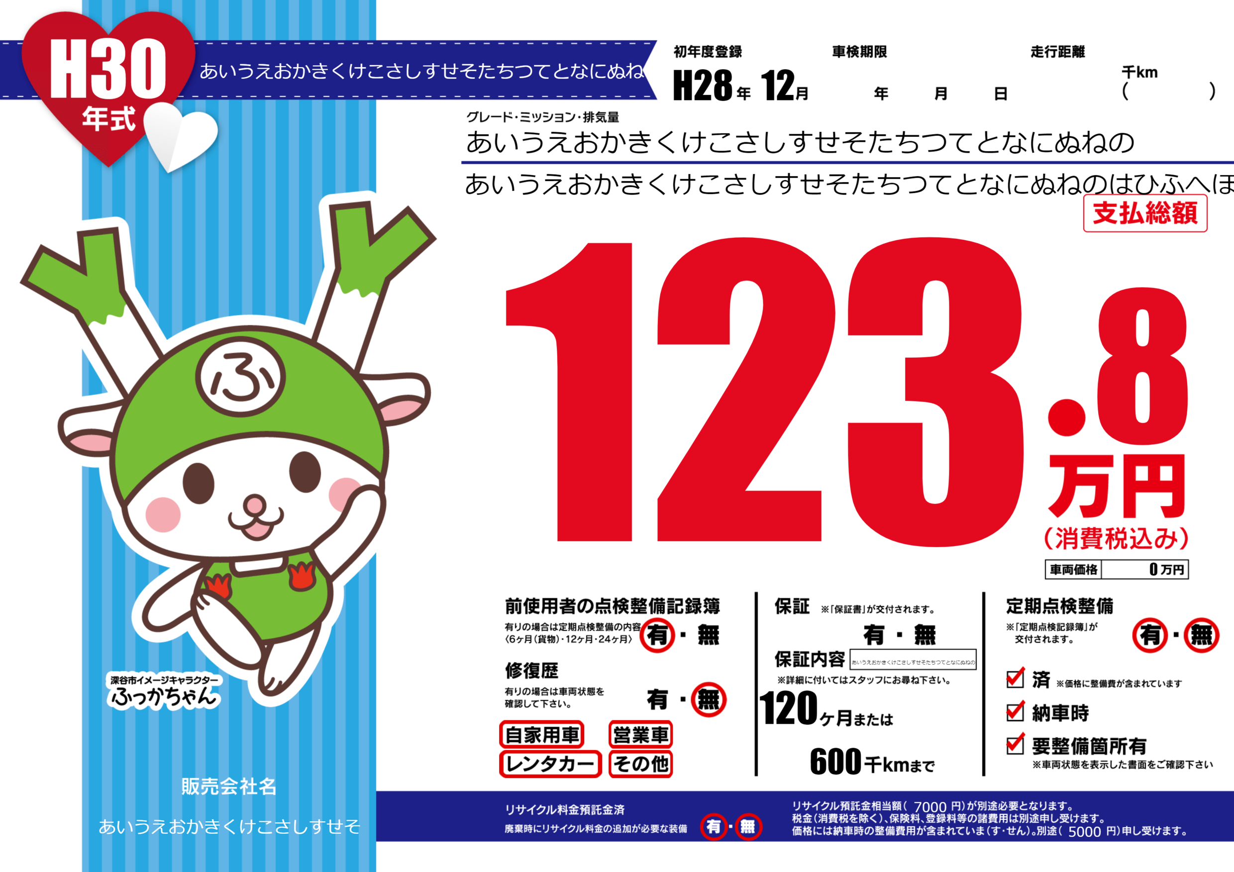 | 定期点検整備 | 定期点検整備あり 定期点検整備なし 定期点検整備済み 要整備箇所あり 納車時あり | ||
