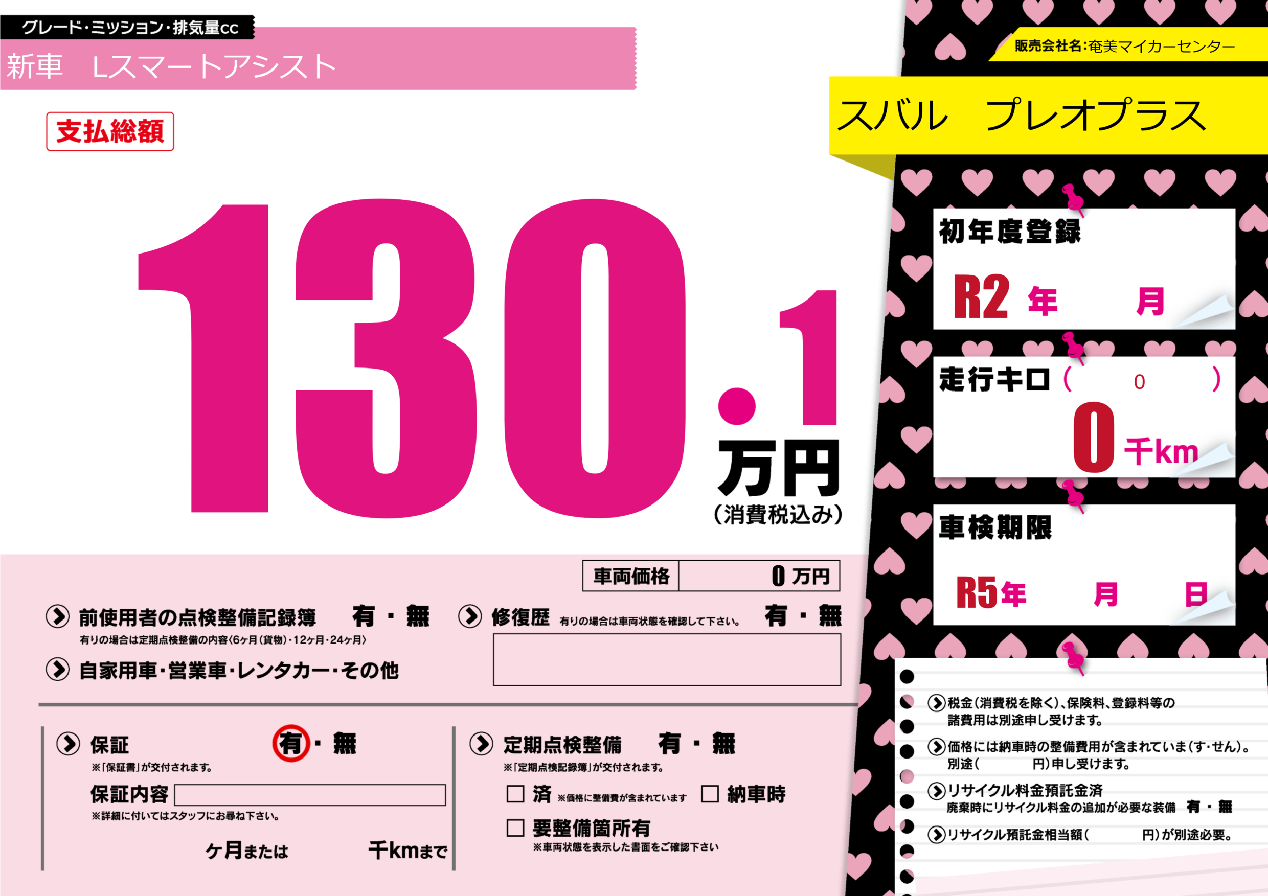 | 走行キロ | - | 初年度登録 | R2年---月 |