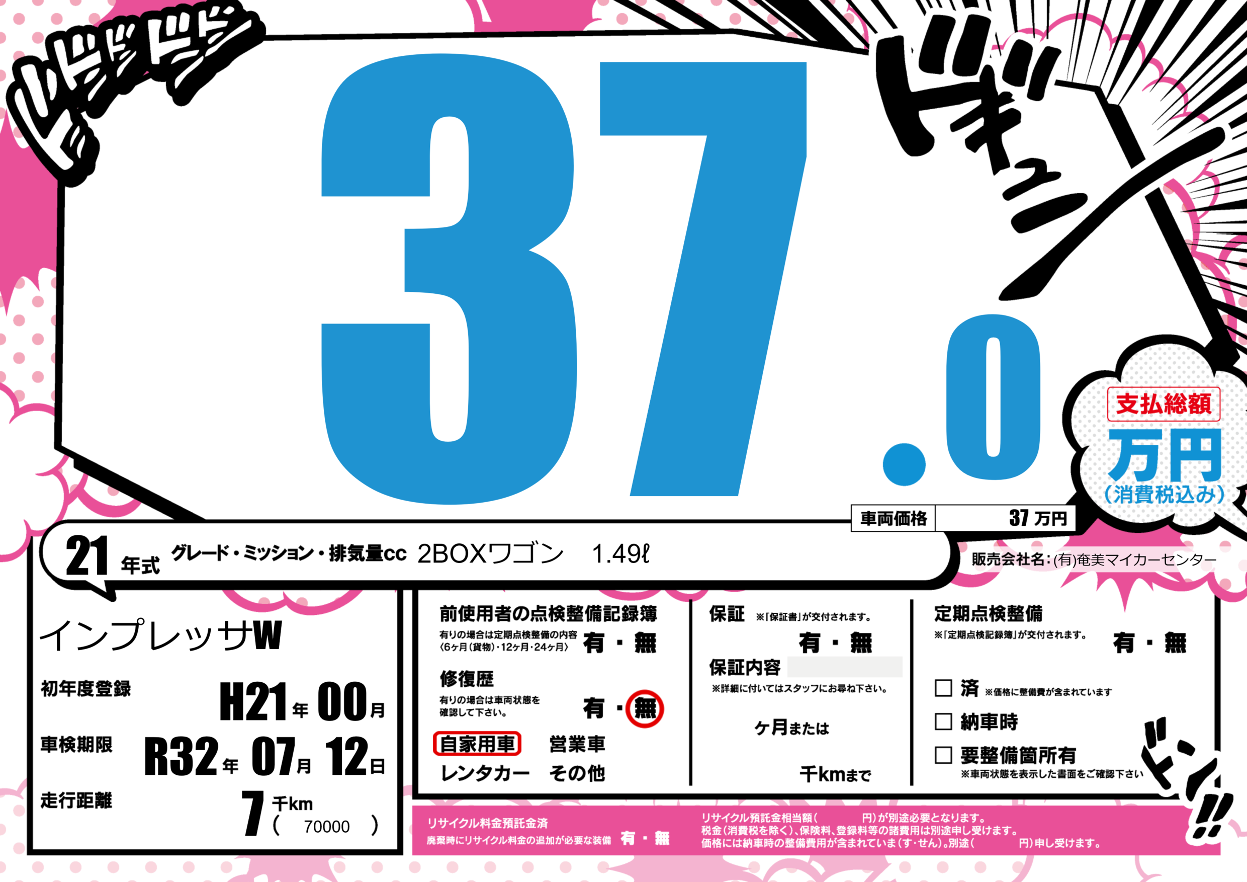 | 車名 | インプレッサW | グレード ミッション 排気量 |