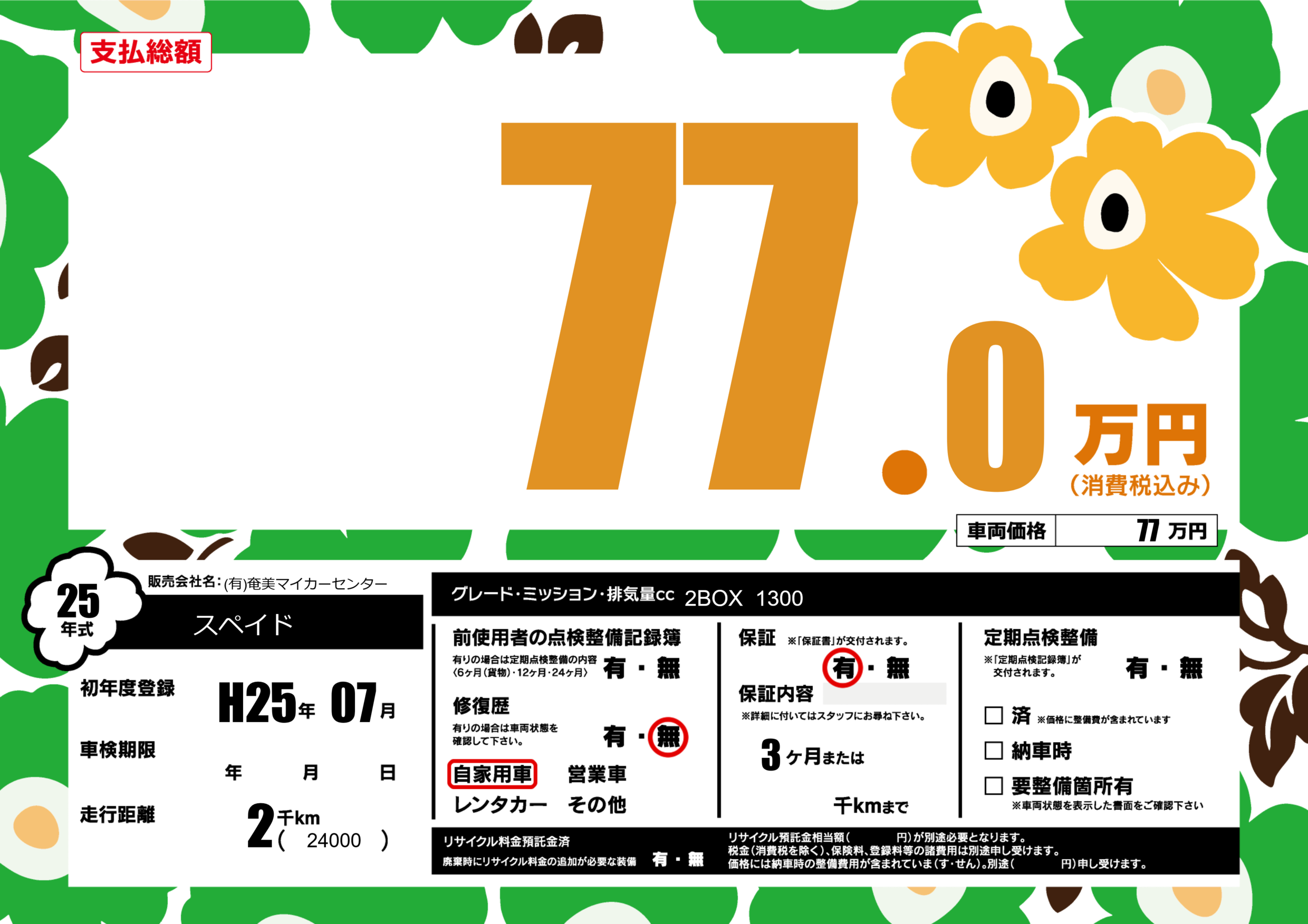 | 走行キロ | 0.2万km | 初年度登録 | H25年07月 |
