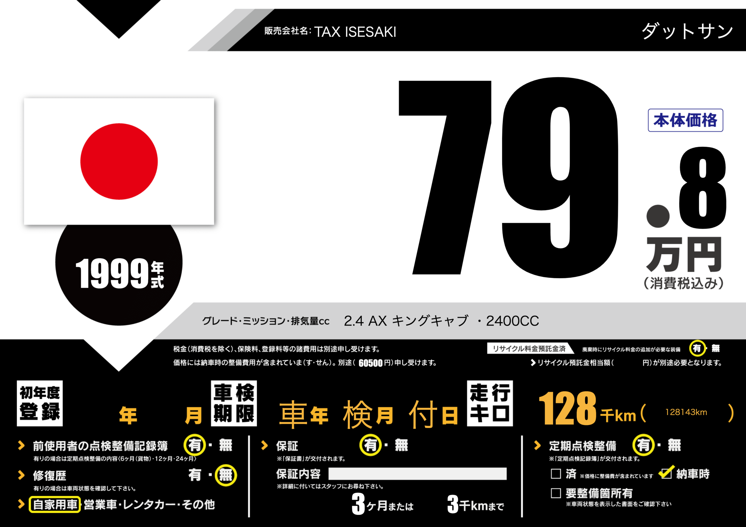 | 走行キロ | 12.8万km | 初年度登録 | --- |