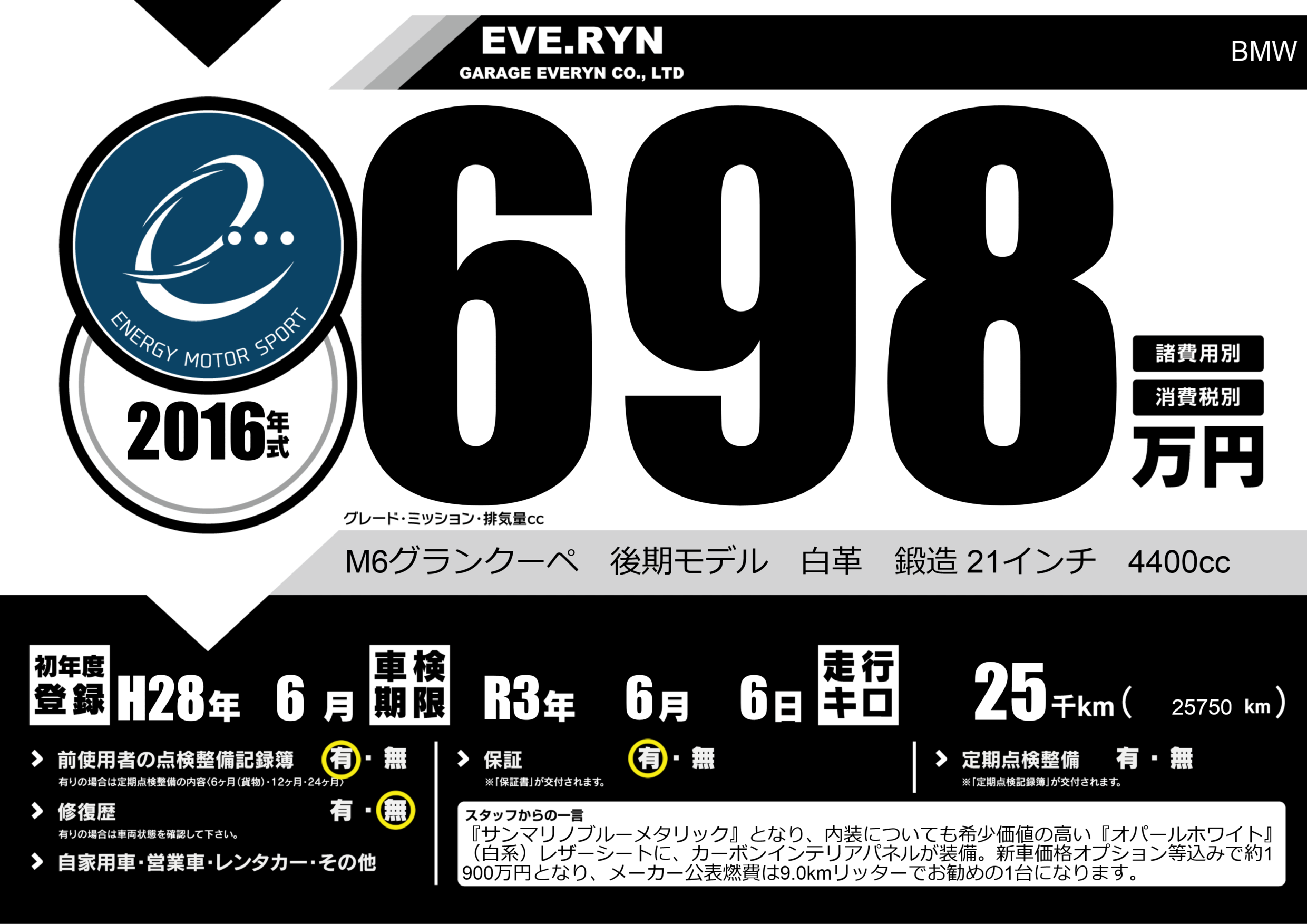 M6グランクーペ 後期モデル 白革 鍛造 21インチ 4400cc |