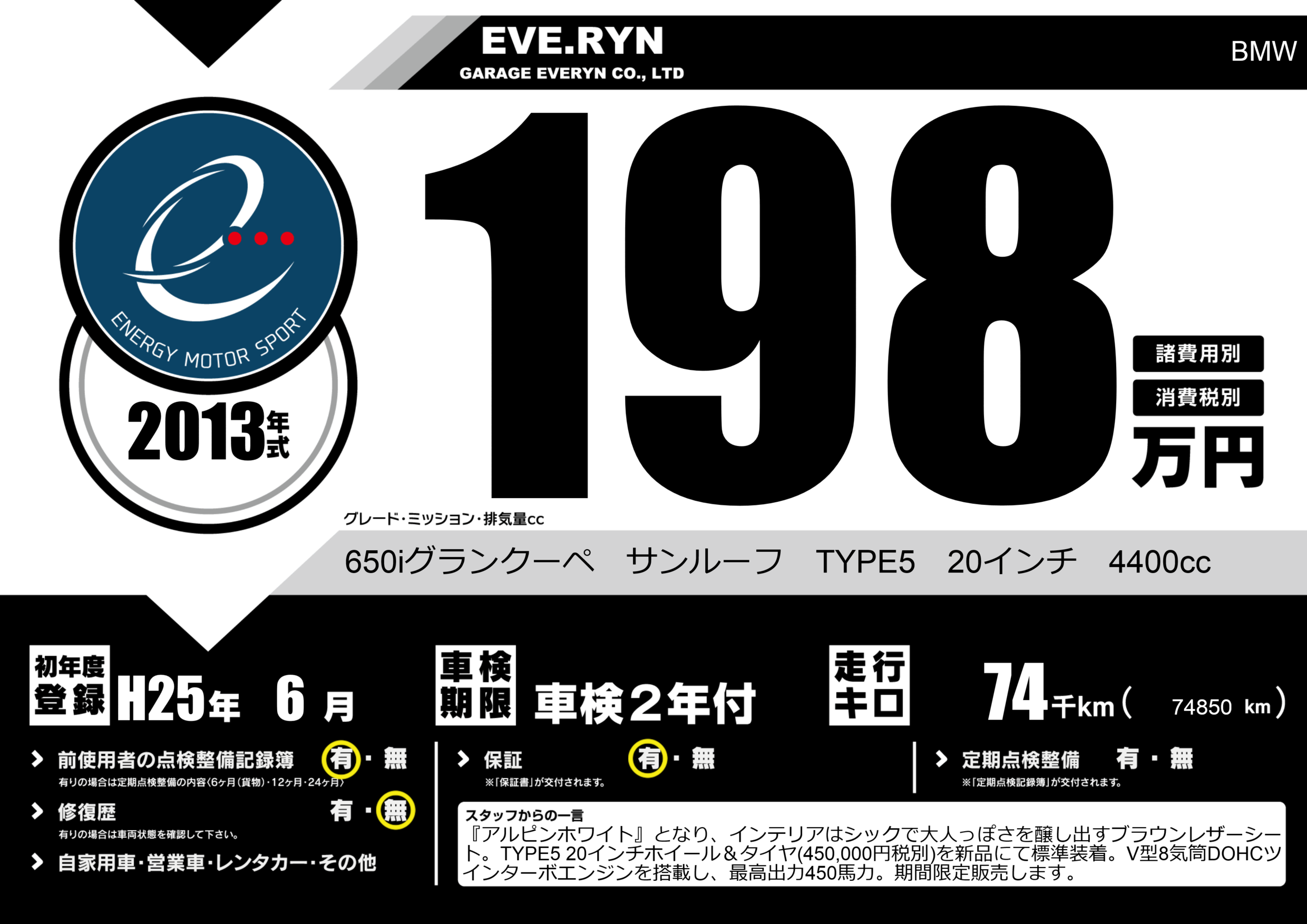 650iグランクーペ サンルーフ TYPE5 20インチ 4400cc |