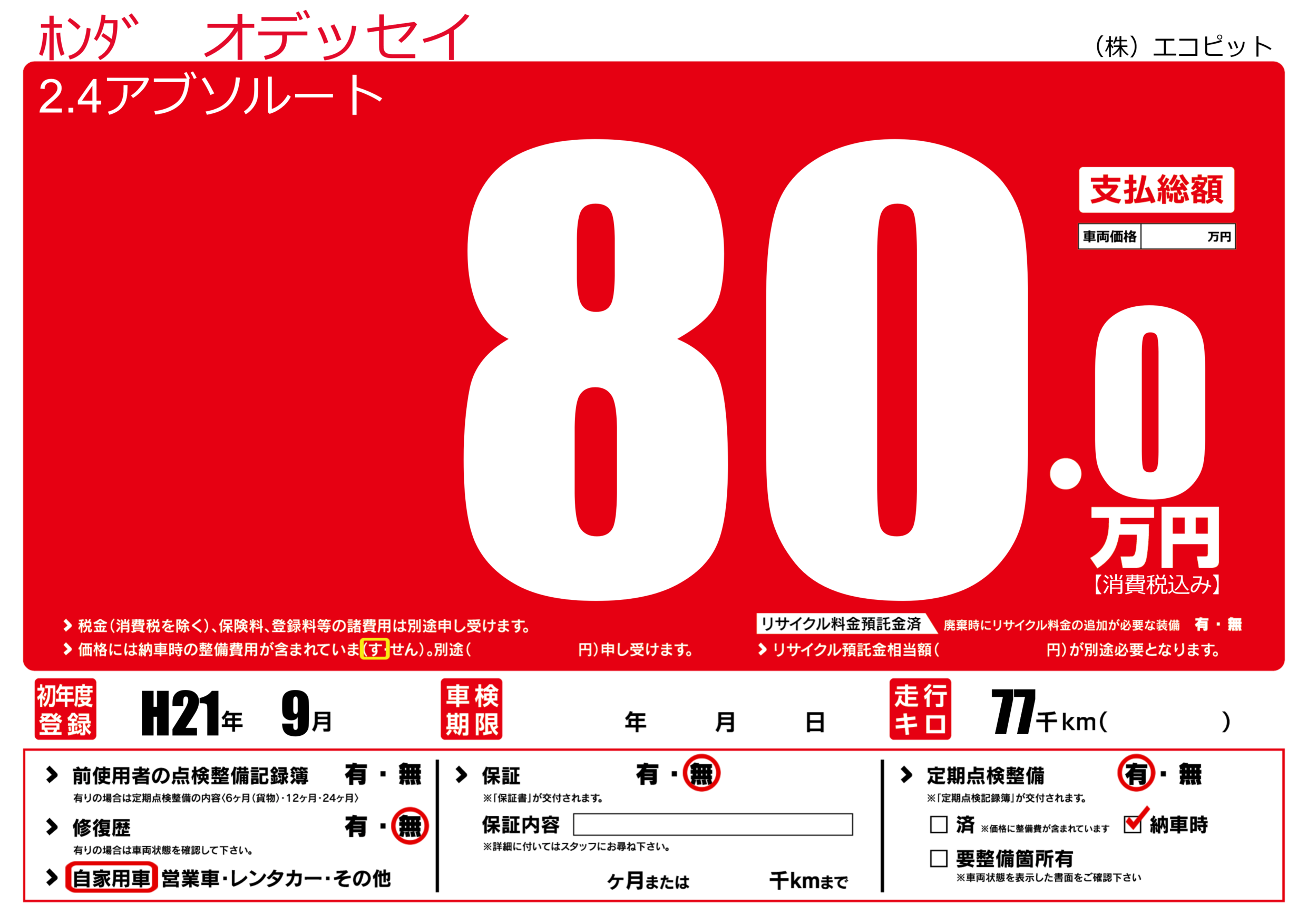 | 走行キロ | 7.7万km | 初年度登録 | H21年9月 |
