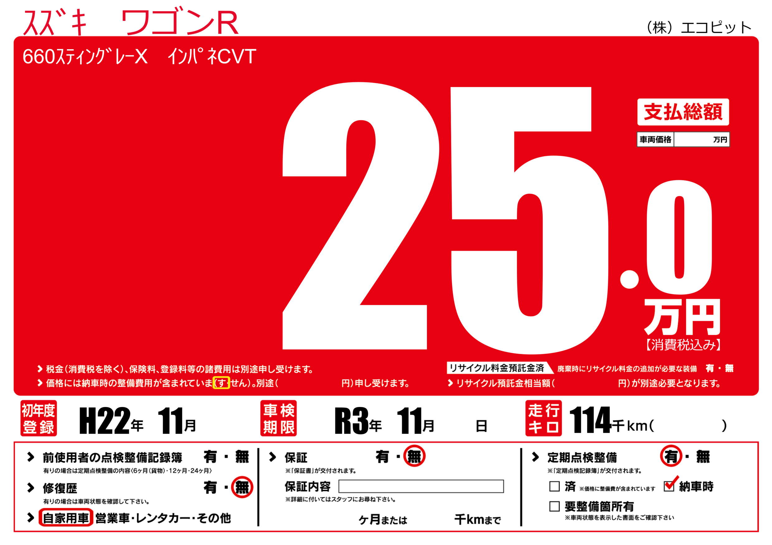 | 車検制限 | R3年 11月 - 日 | ||