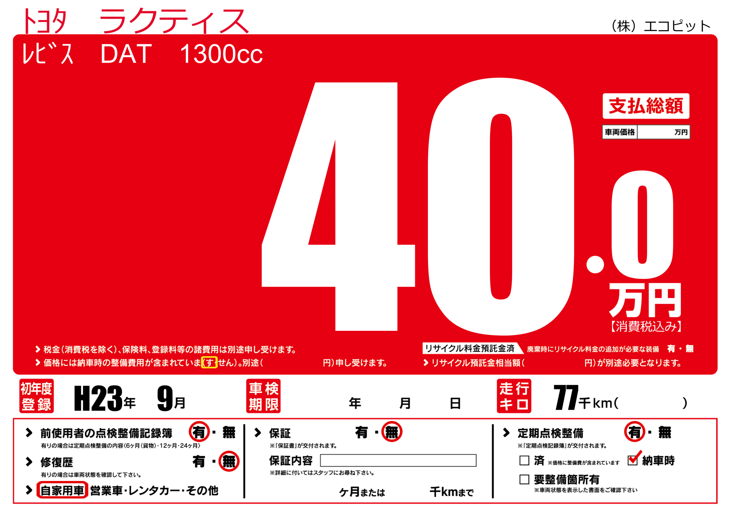 | 車名 | トヨタ ラクティス | グレード ミッション 排気量 |