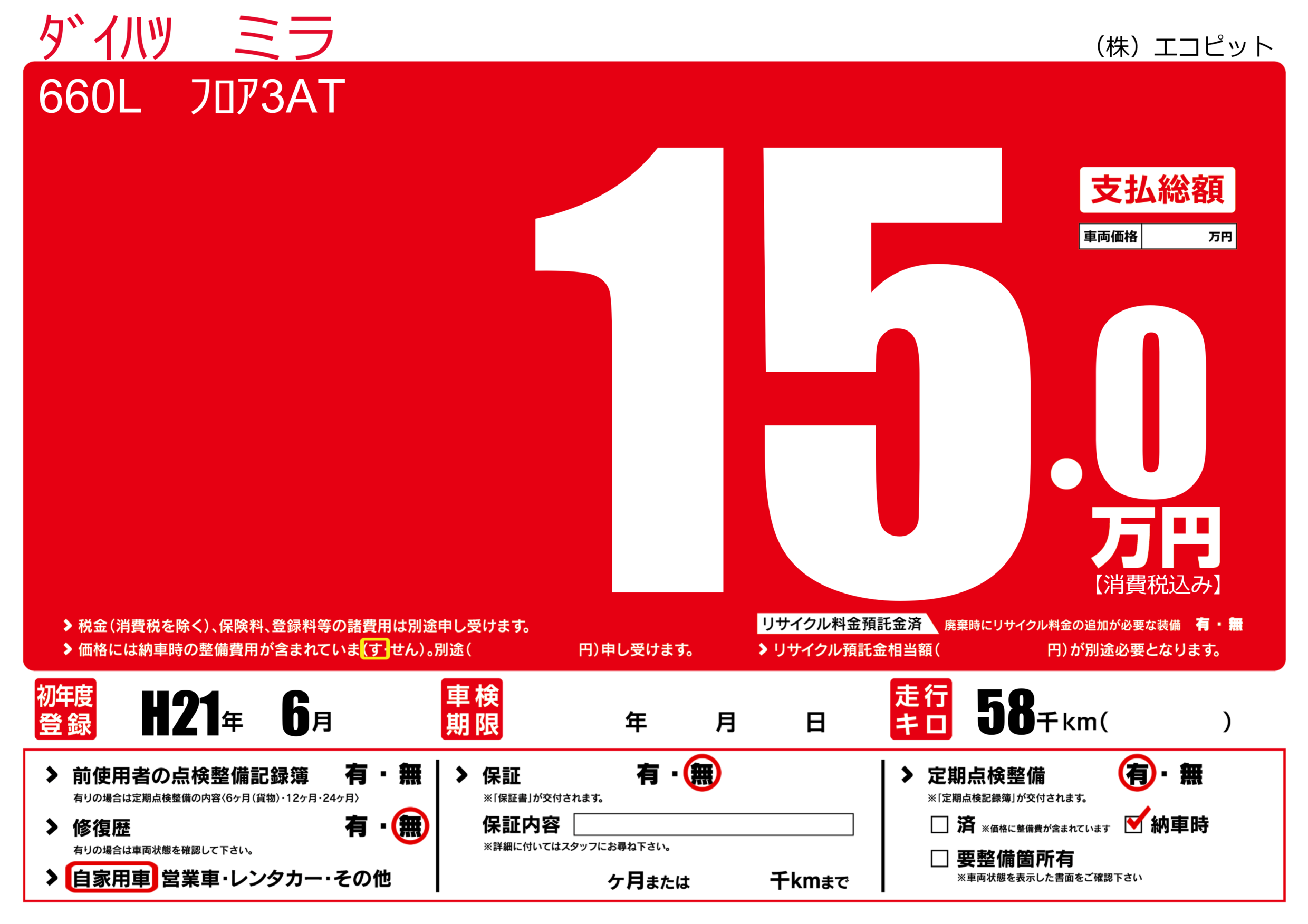 なし | リサイクル預託金相当額 | ( 0円)が別途必要 |