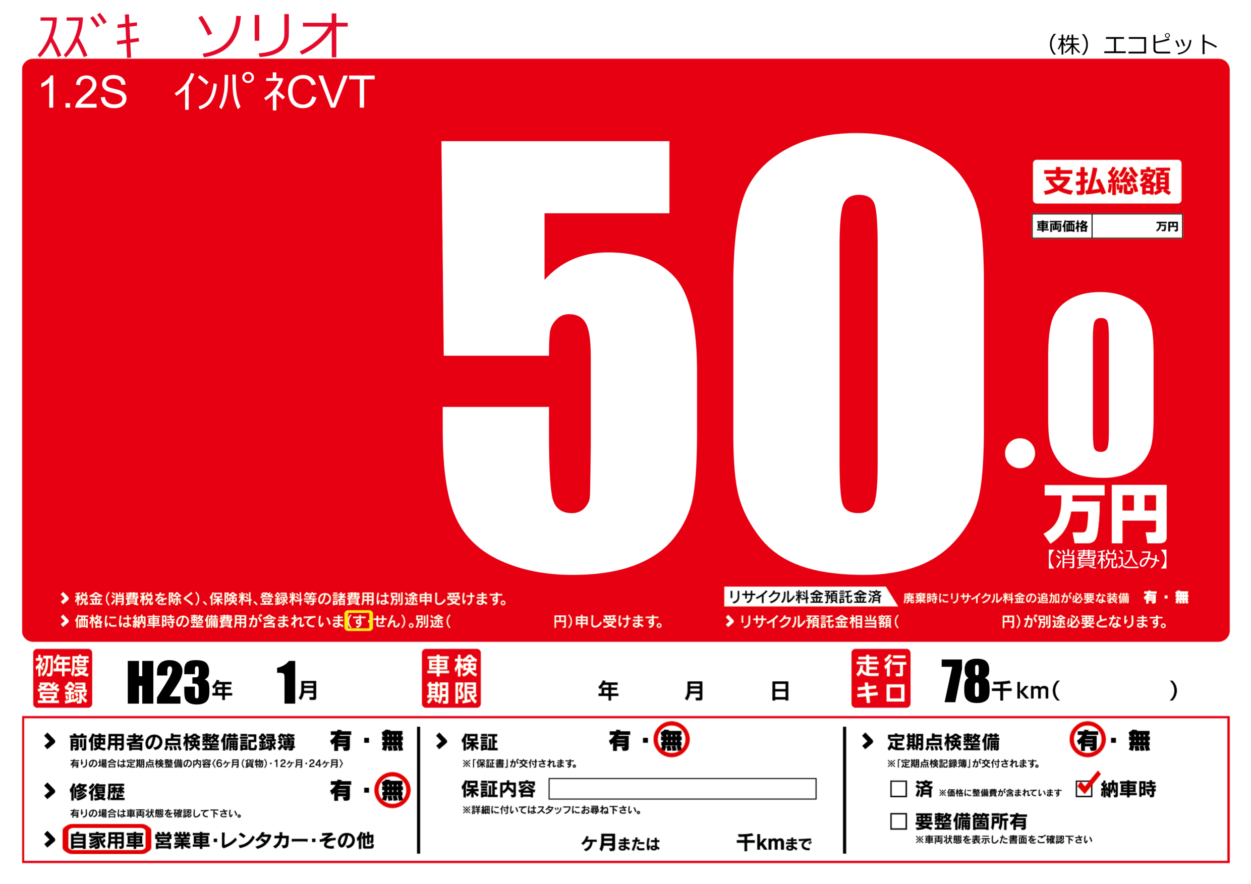 | 走行キロ | 7.8万km | 初年度登録 | H23年1月 |