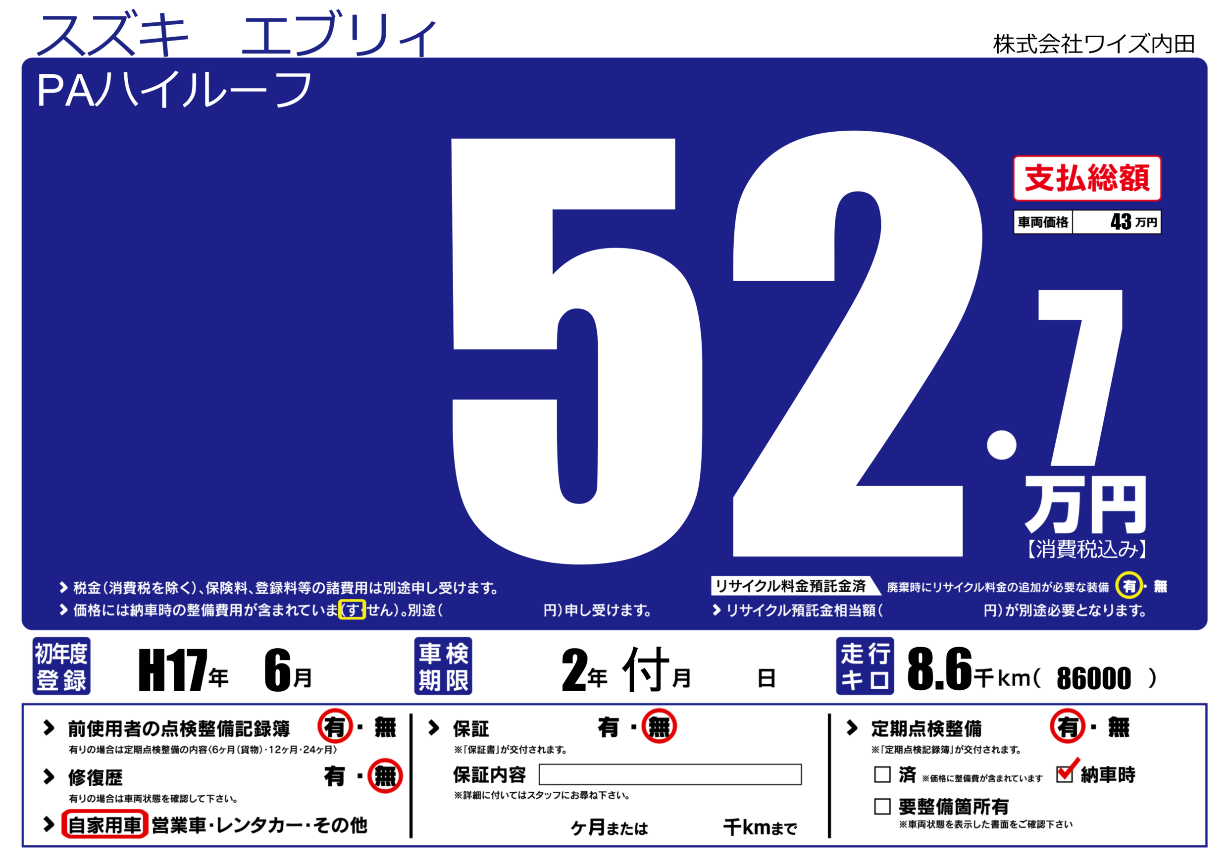 | 車名 | スズキ エブリィ | グレード ミッション 排気量 |
