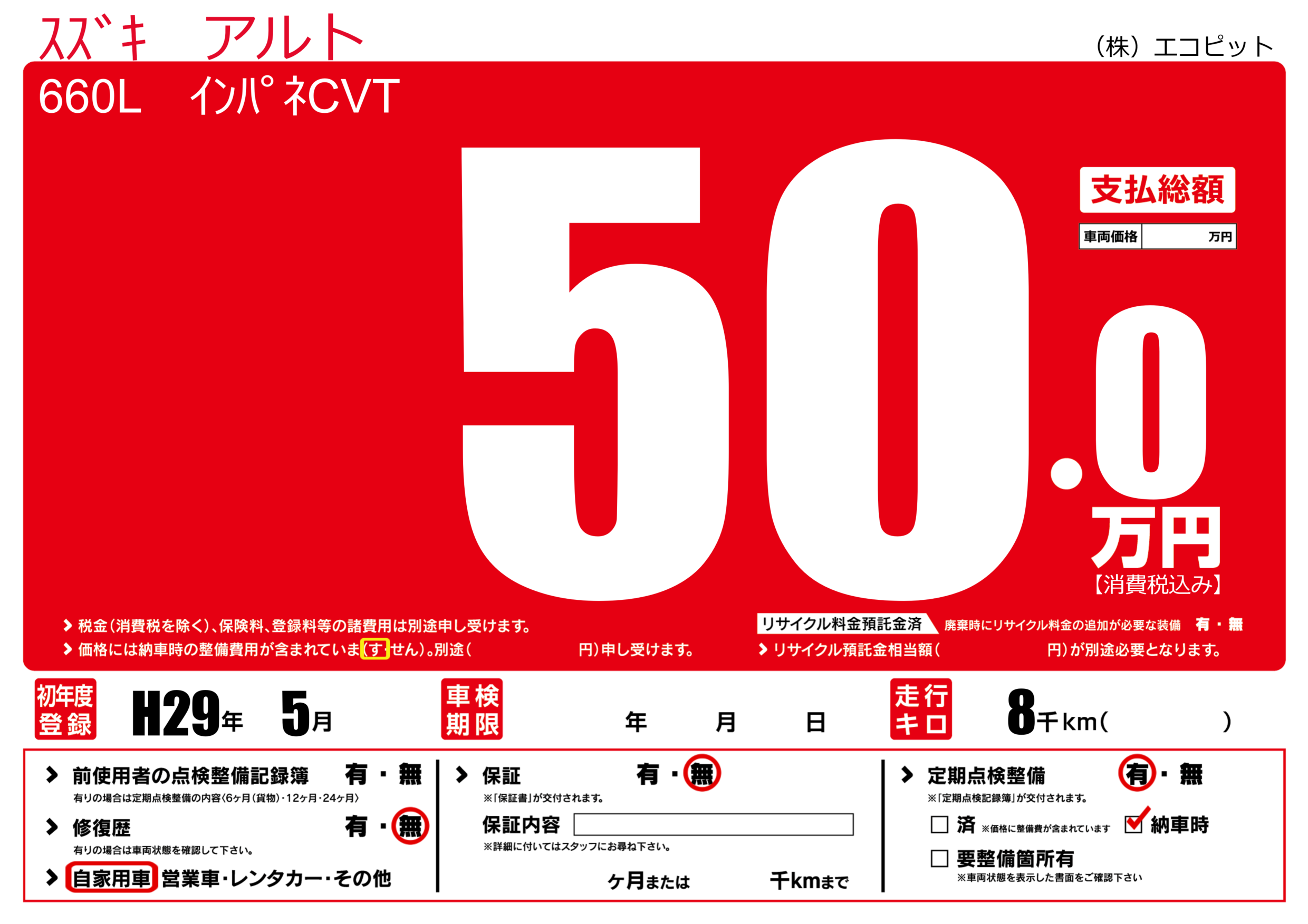 | 車名 | スズキ アルト | グレード ミッション 排気量 |