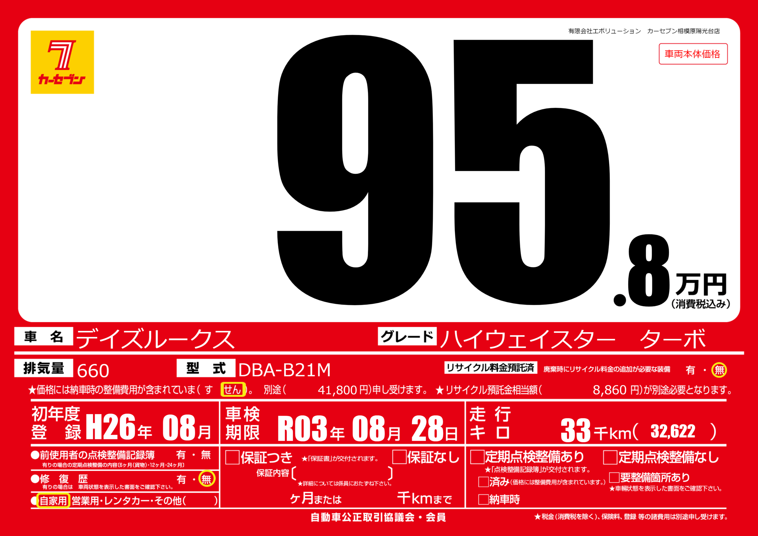 | 走行キロ | 3.3万km | 初年度登録 | H26年08月 |