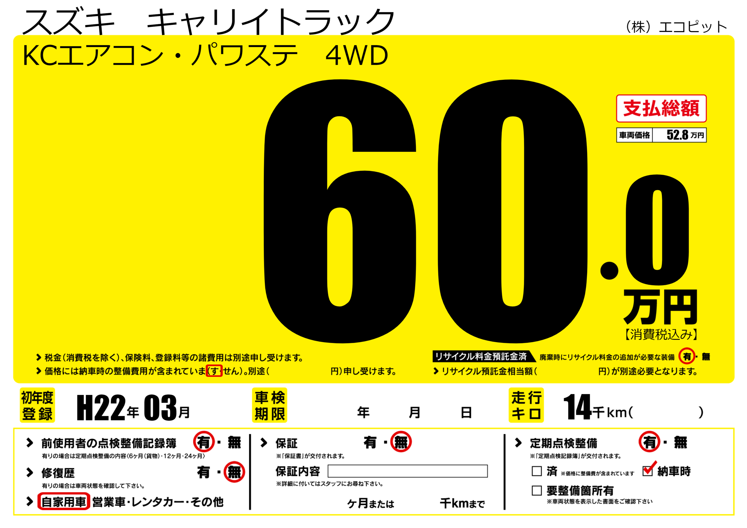 | 車名 | スズキ キャリイトラック | グレード ミッション 排気量 |