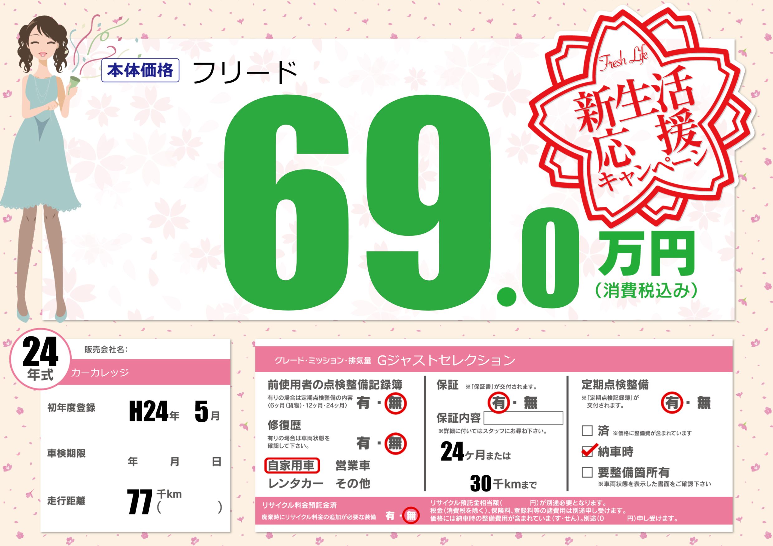 保証付き 保証内容(---) 24ヶ月または(30)千kmまで |