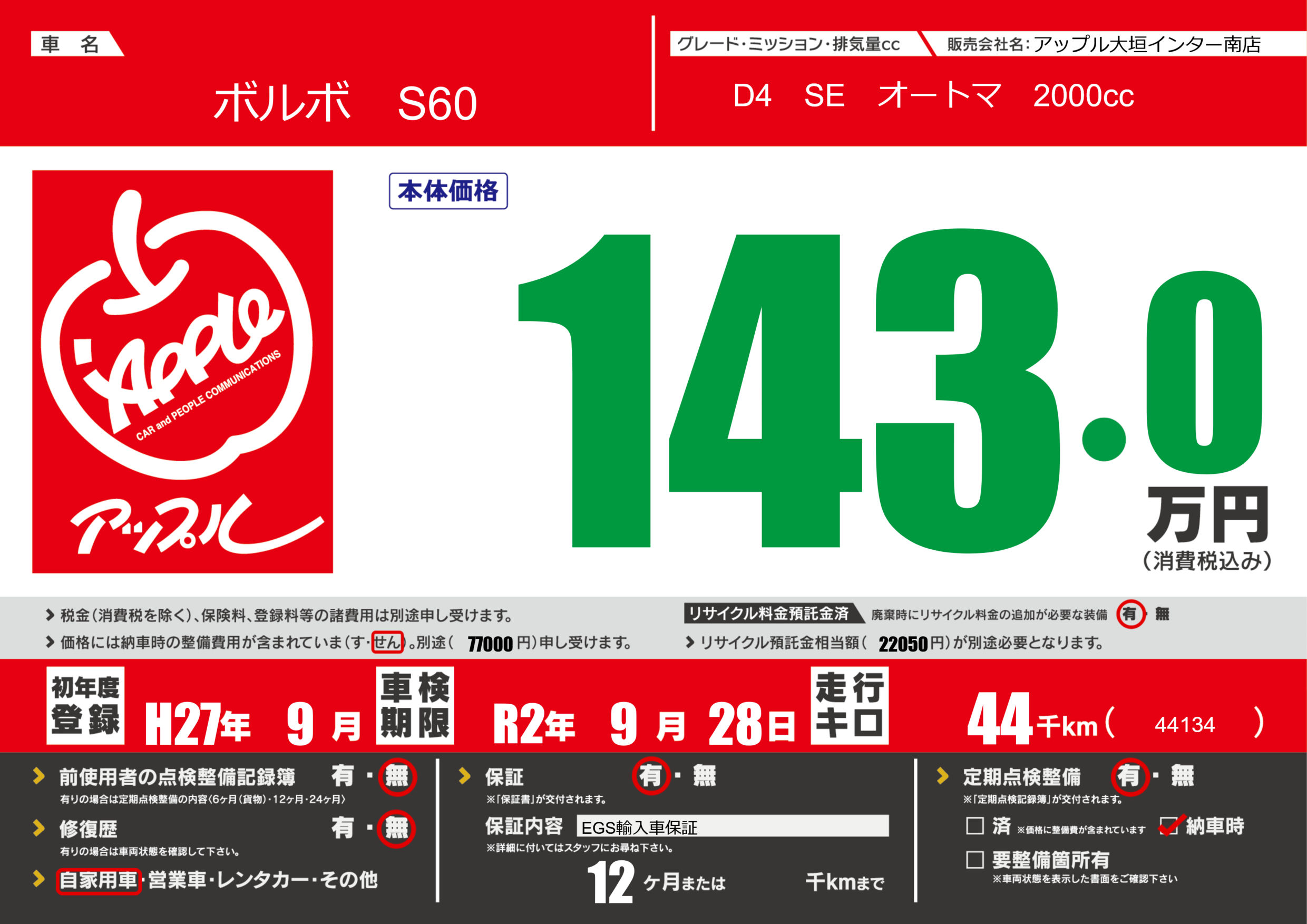 保証付き 保証内容(EGS輸入車保証) 12ヶ月または()千kmまで |