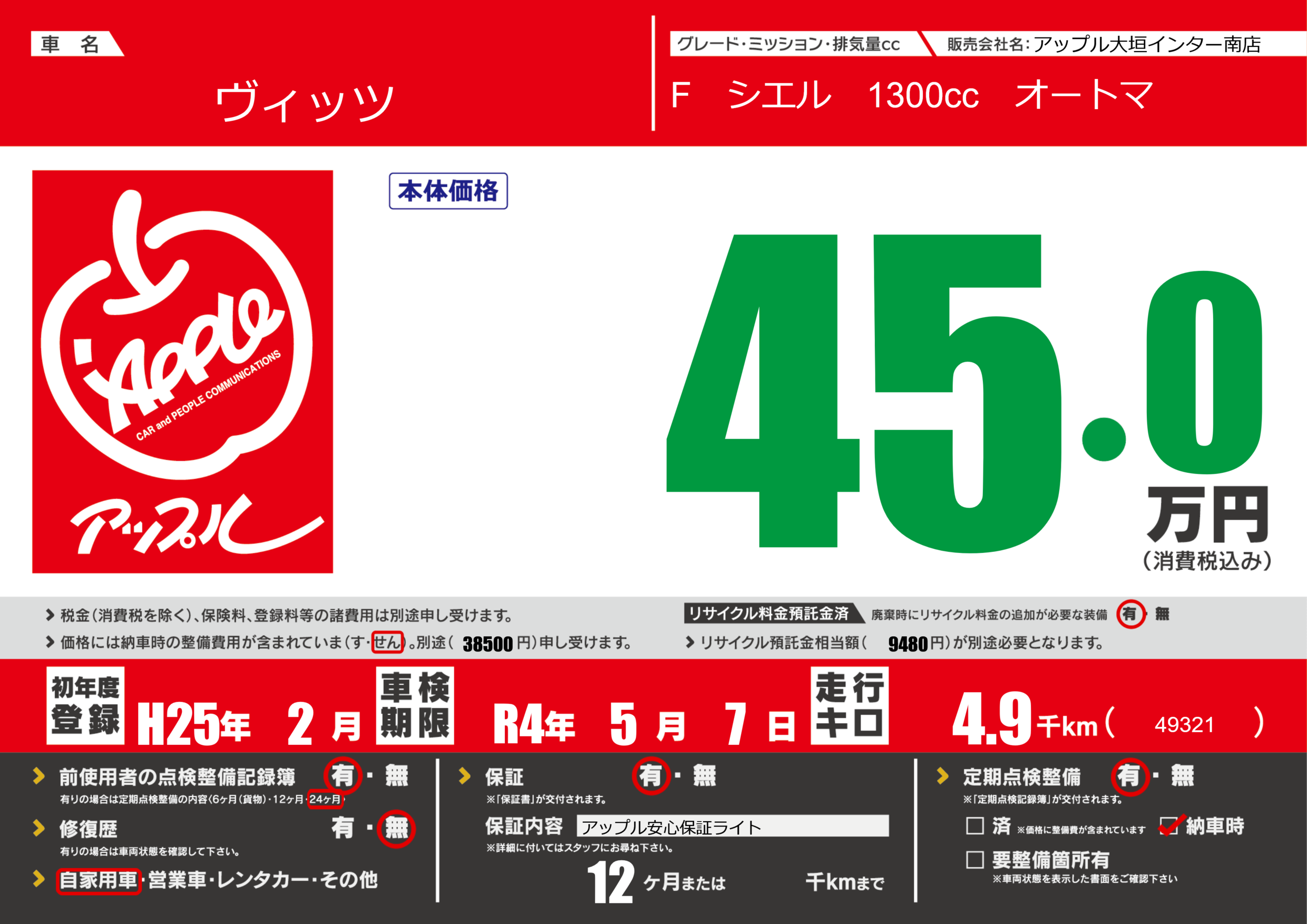 保証付き 保証内容(アップル安心保証ライト) 12ヶ月または()千kmまで |