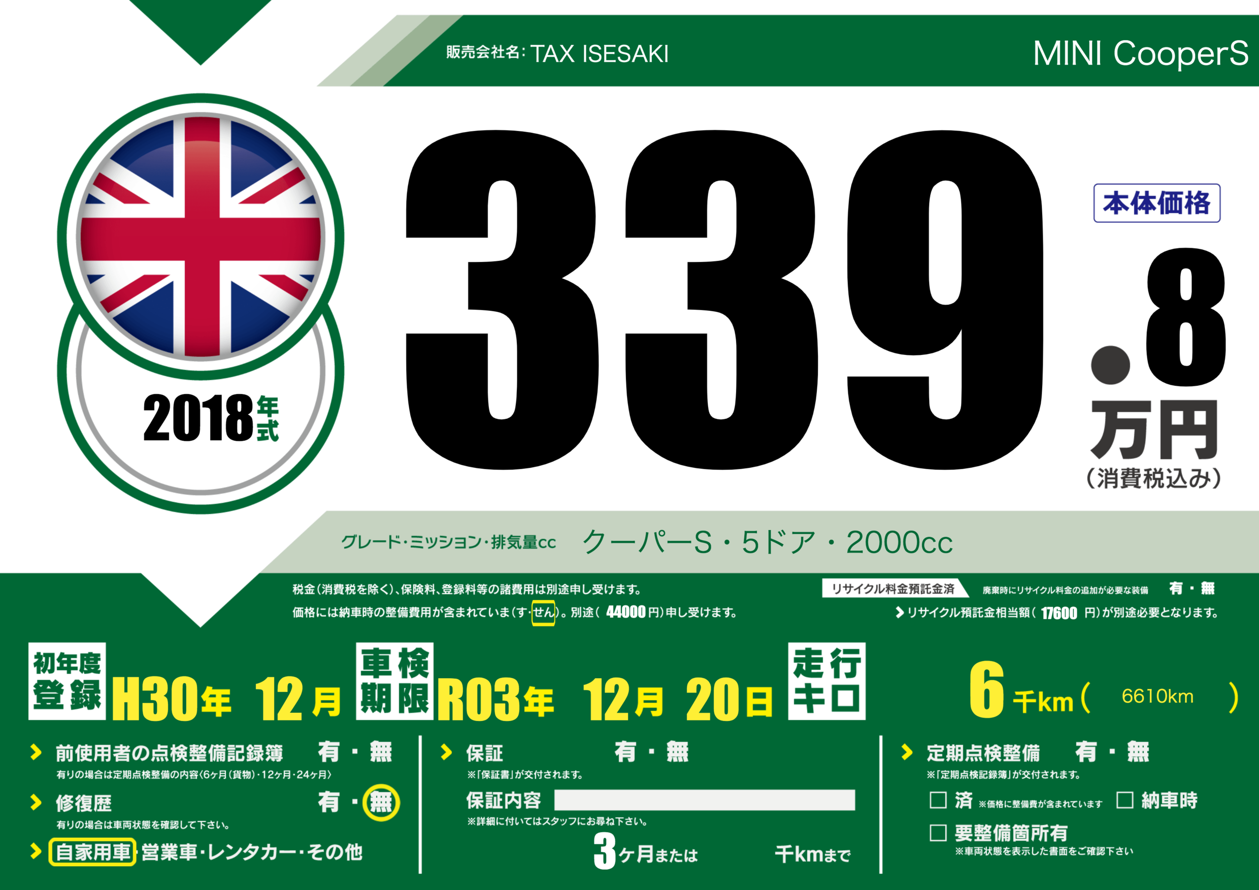 | 車名 | MINI CooperS | グレード ミッション 排気量 |