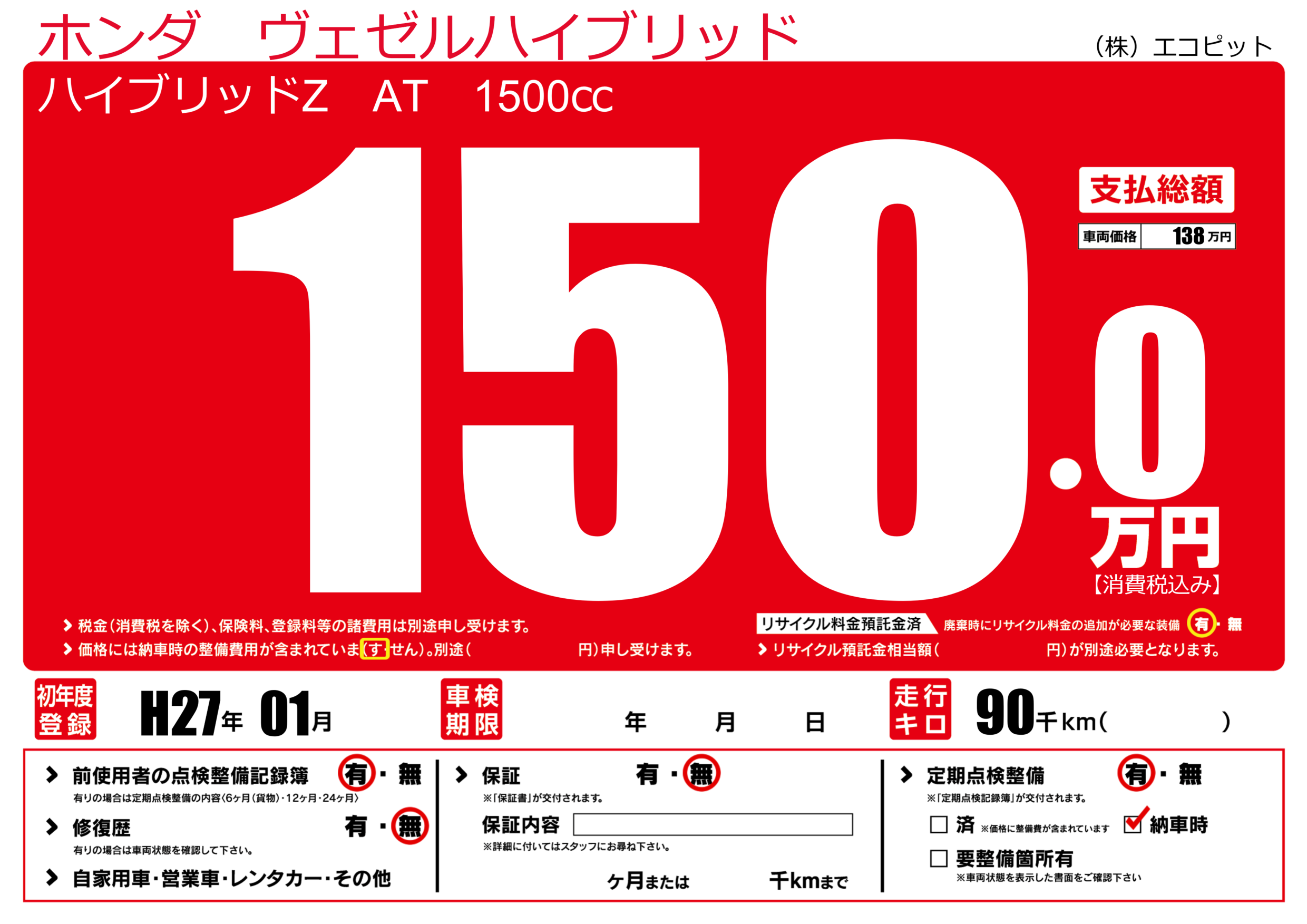 | 車名 | ホンダ ヴェゼルハイブリッド | グレード ミッション 排気量 |