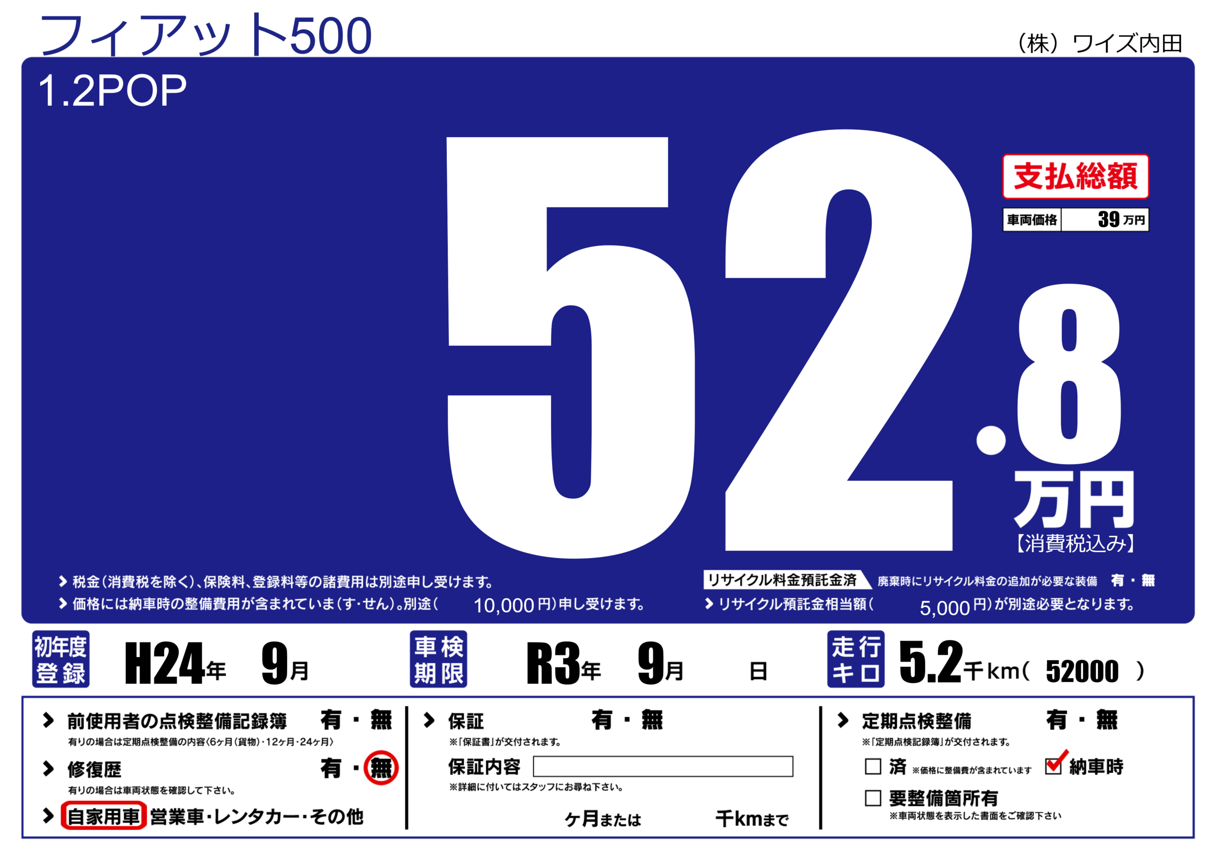 | 車名 | フィアット500 | グレード ミッション 排気量 |