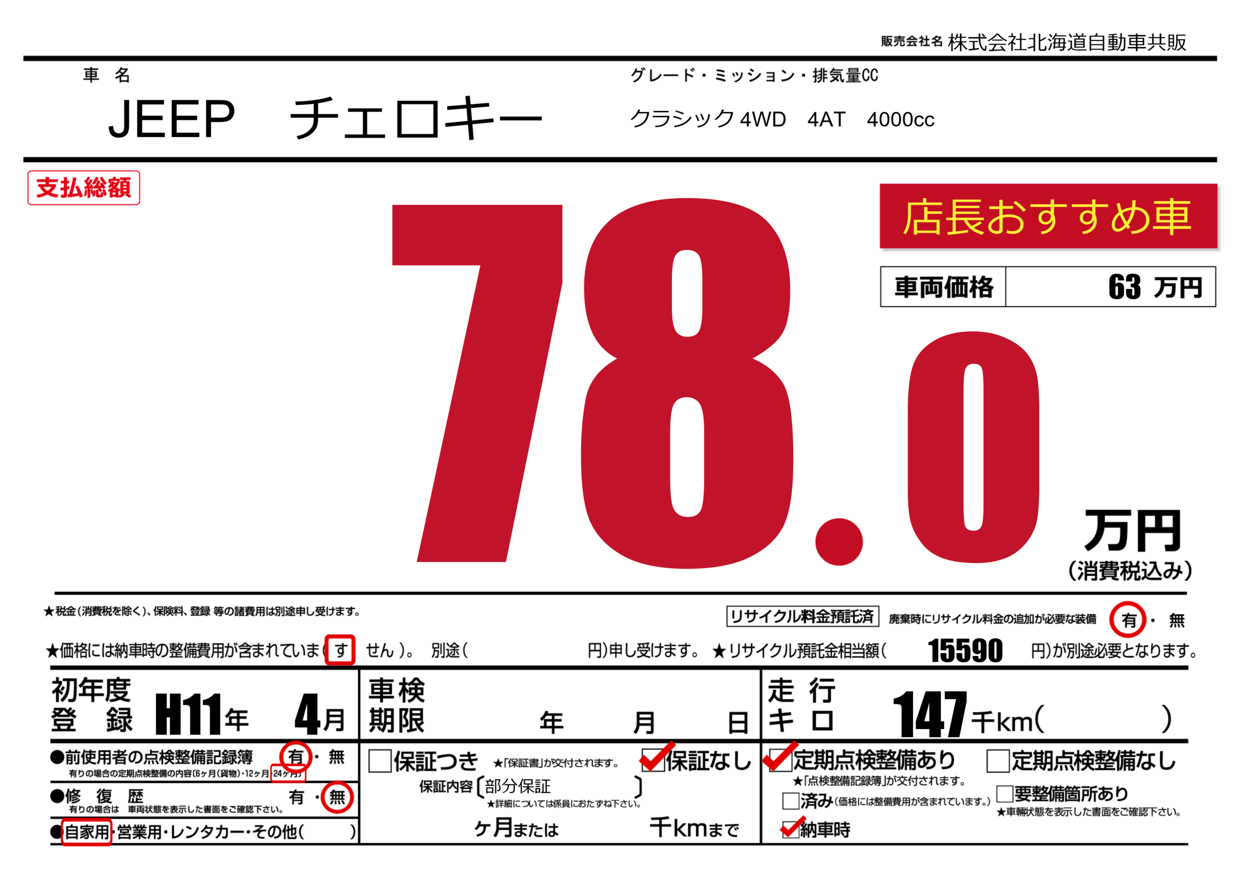 | 車名 | JEEP チェロキー | グレード ミッション 排気量 |
