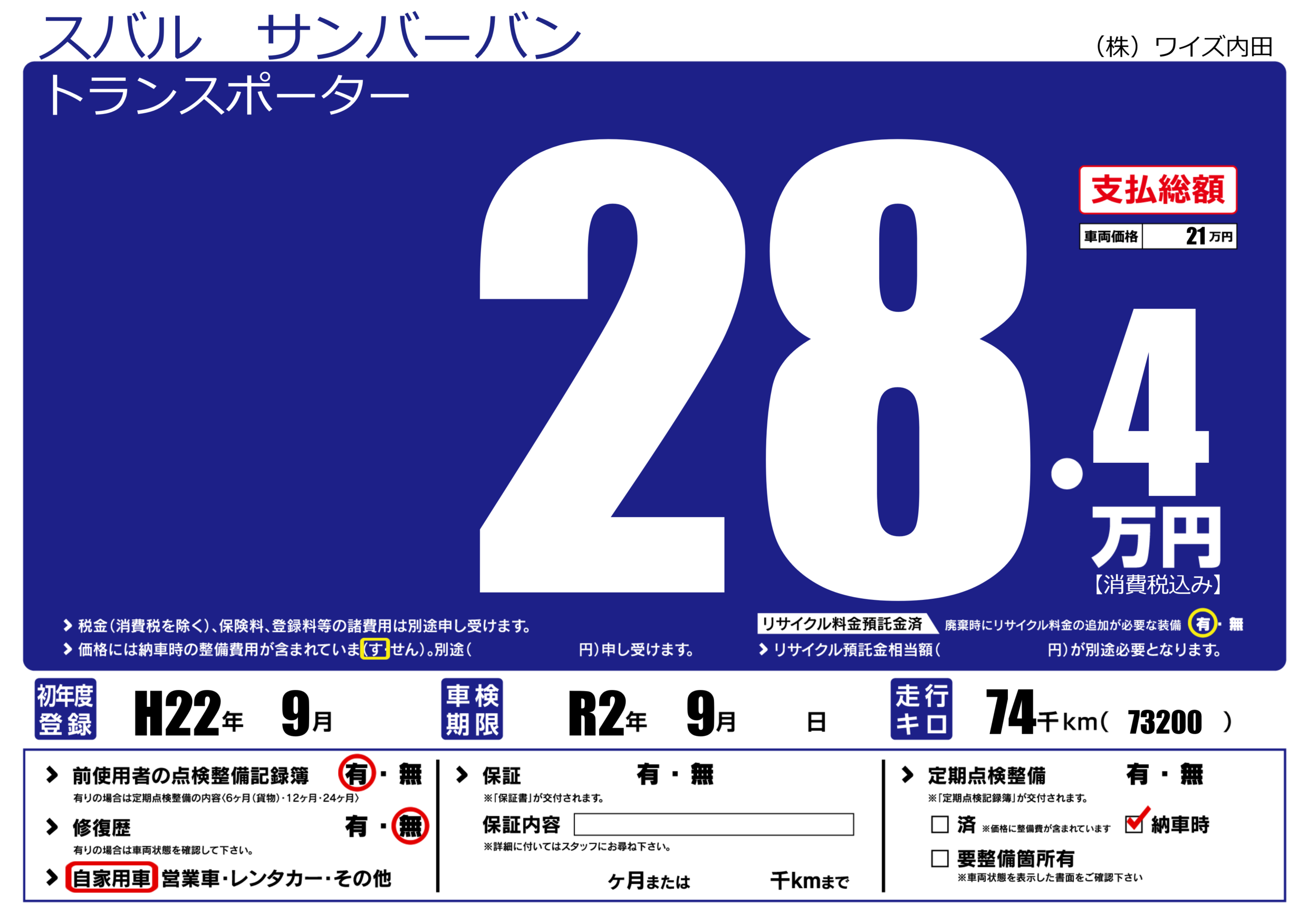 | 車名 | スバル サンバーバン | グレード ミッション 排気量 |