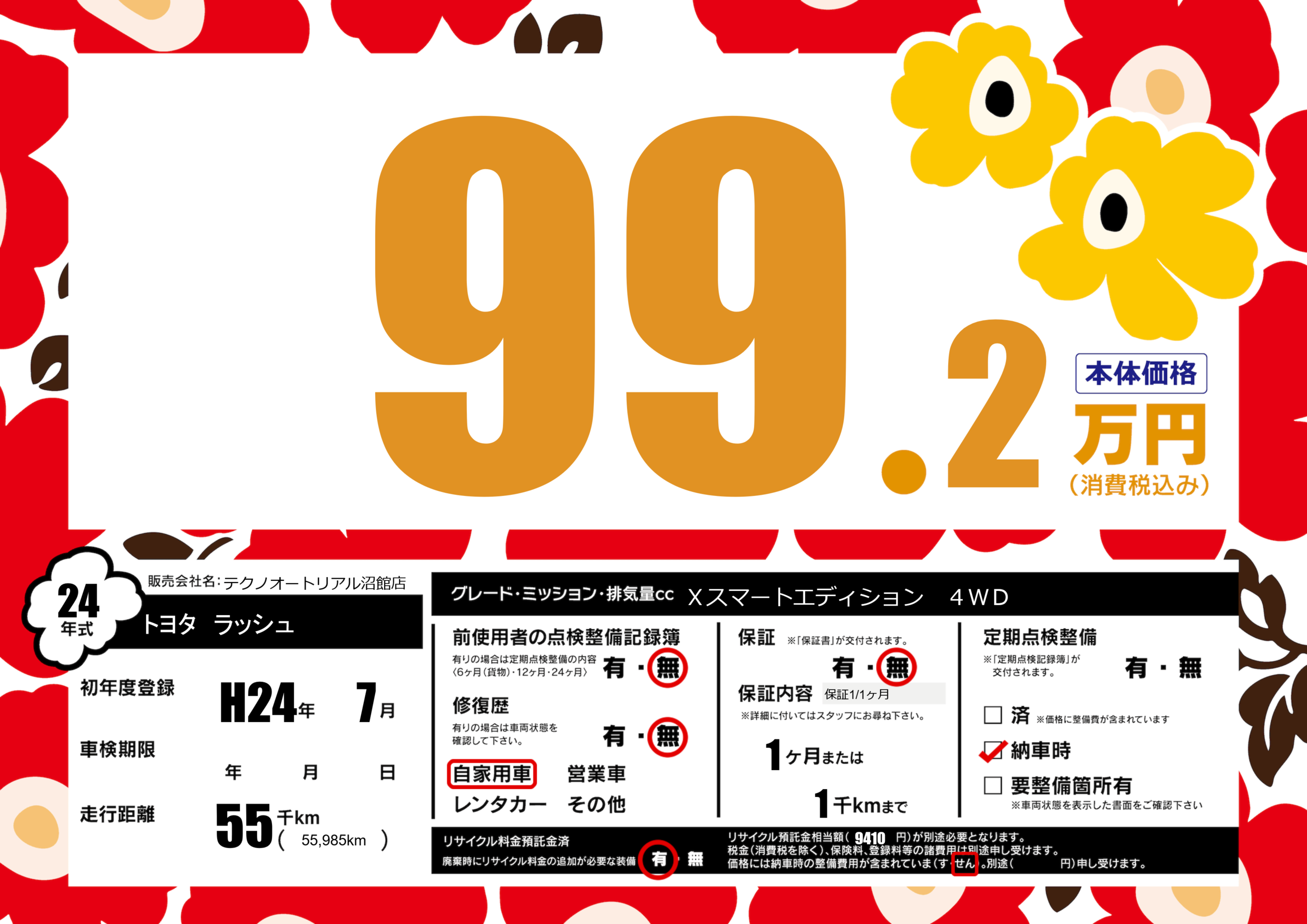 | 車名 | トヨタ ラッシュ | グレード ミッション 排気量 |