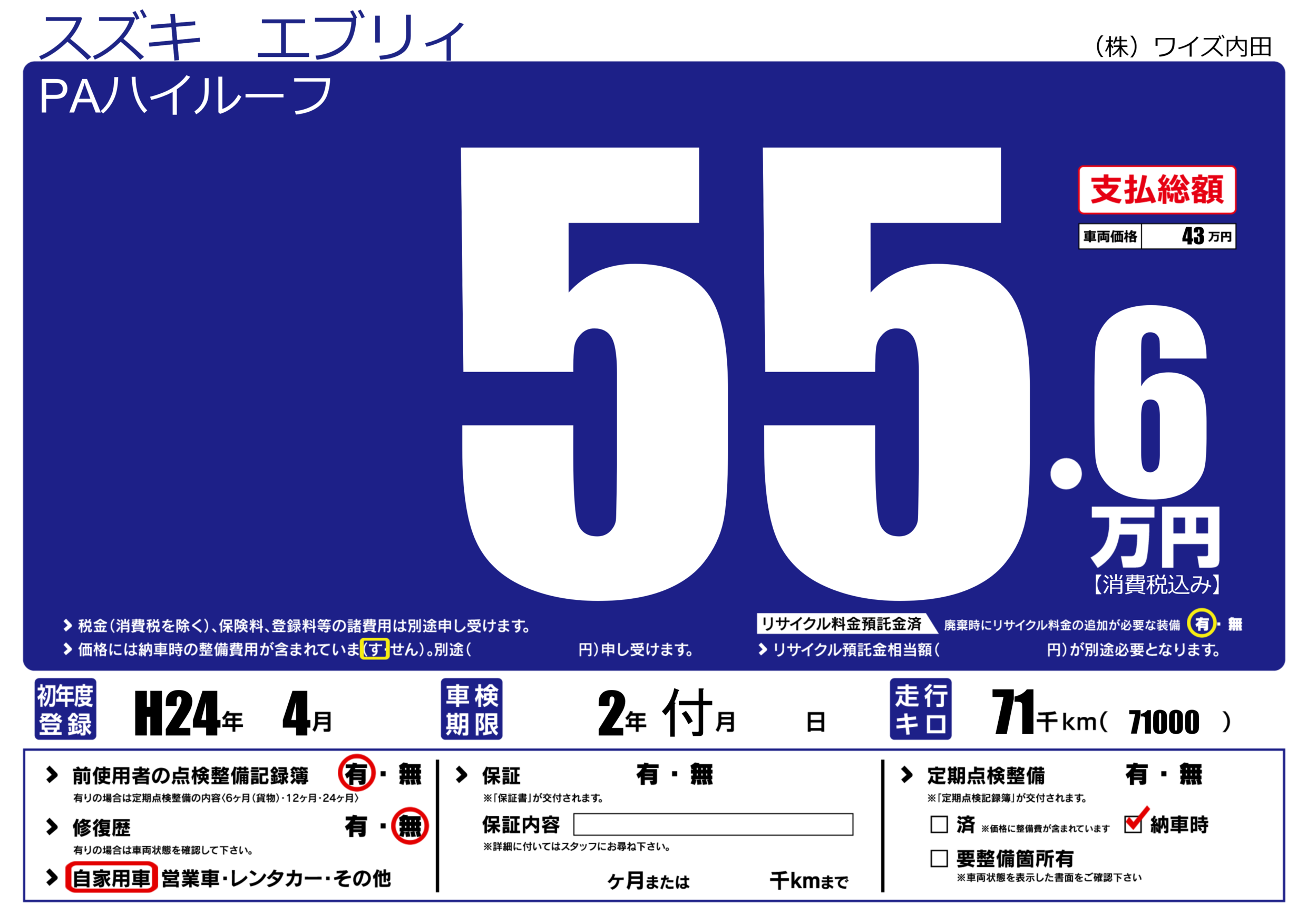 | 走行キロ | 7.1万km | 初年度登録 | H24年4月 |