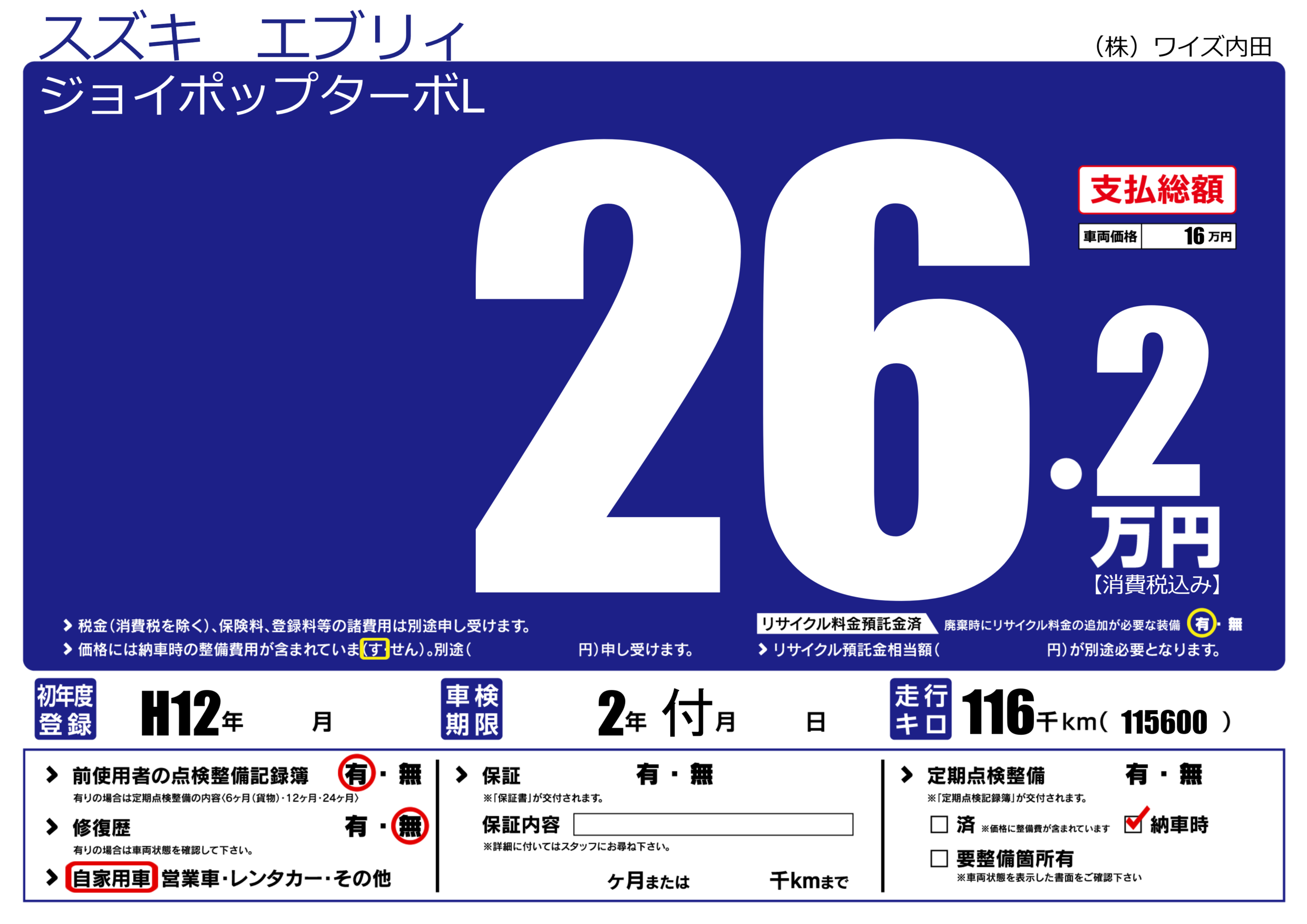 | 車名 | スズキ エブリィ | グレード ミッション 排気量 |