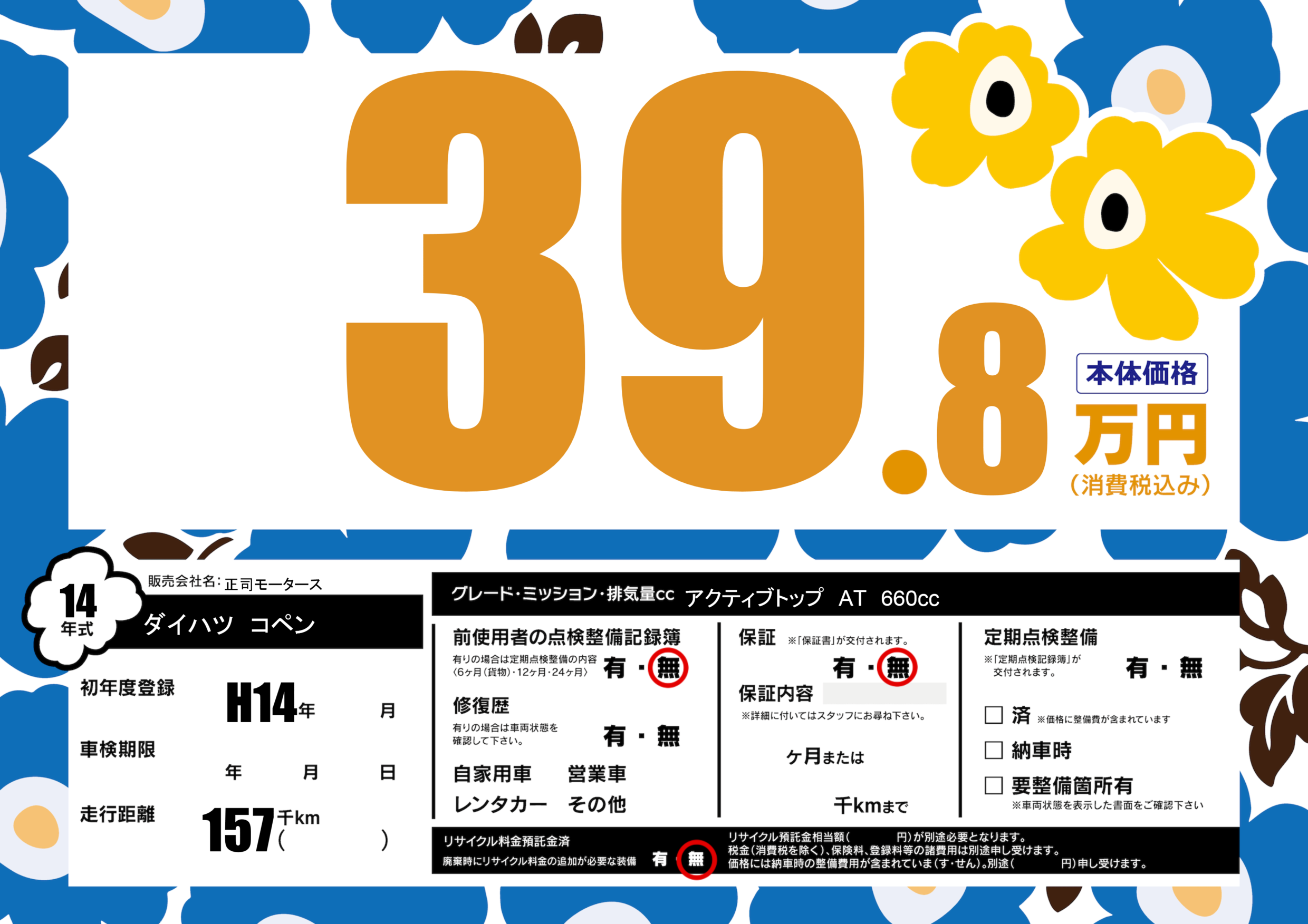 | 車名 | ダイハツ コペン | グレード ミッション 排気量 |