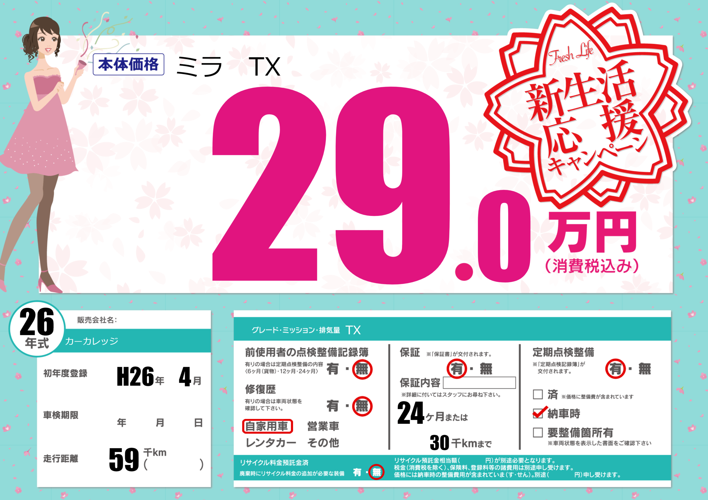 | 車名 | ミラ TX | グレード ミッション 排気量 |