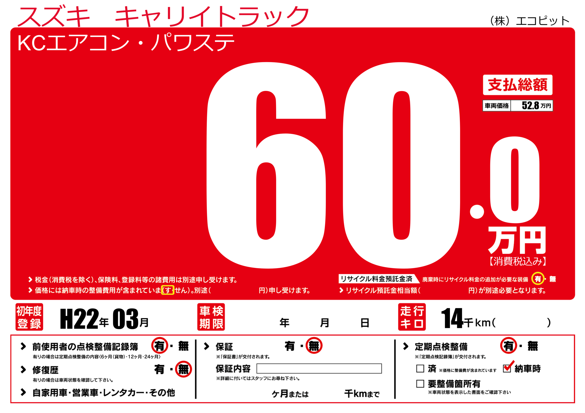 | 車名 | スズキ キャリイトラック | グレード ミッション 排気量 |