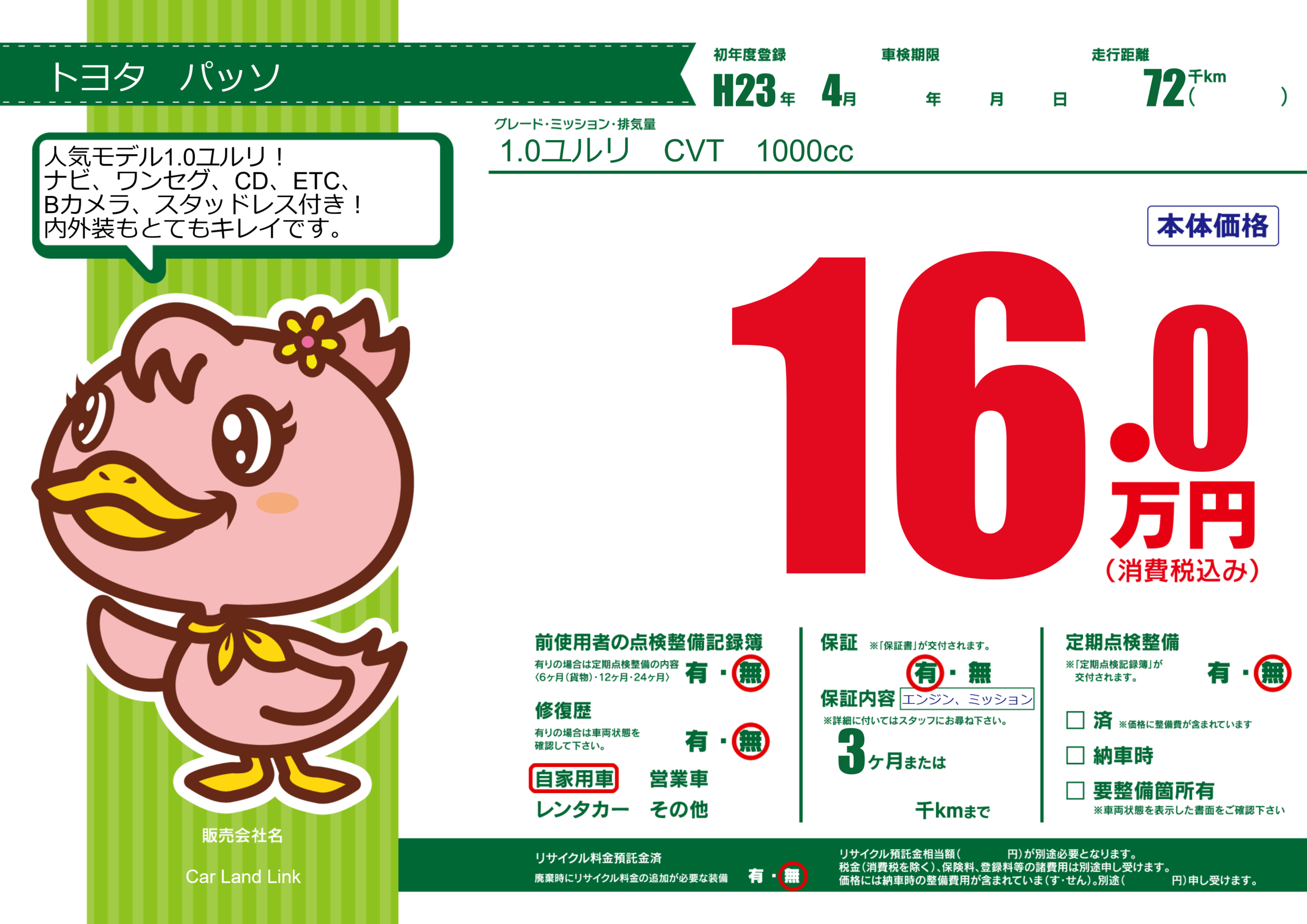 | 車名 | トヨタ パッソ | グレード ミッション 排気量 |