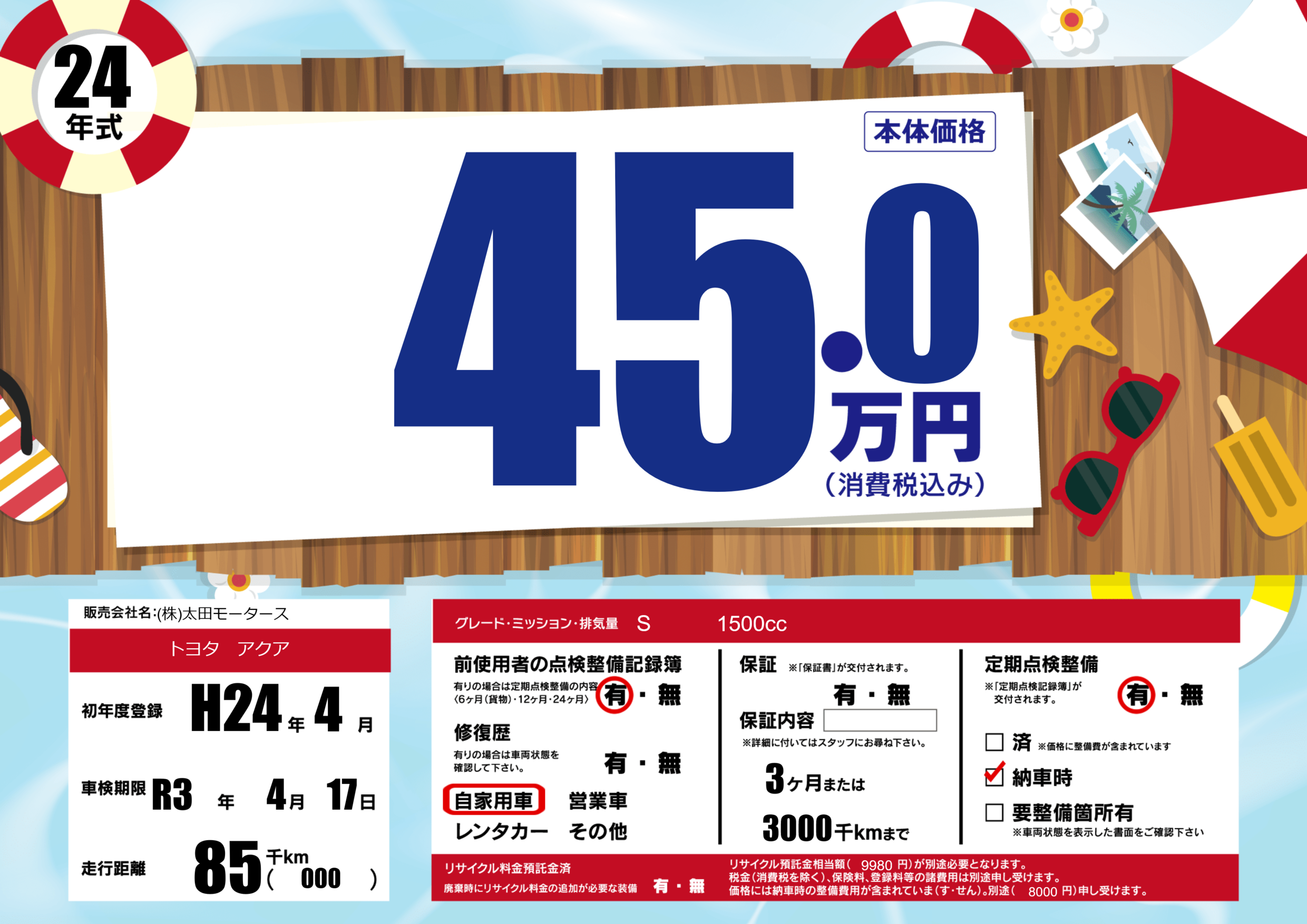 | 車名 | トヨタ アクア | グレード ミッション 排気量 |