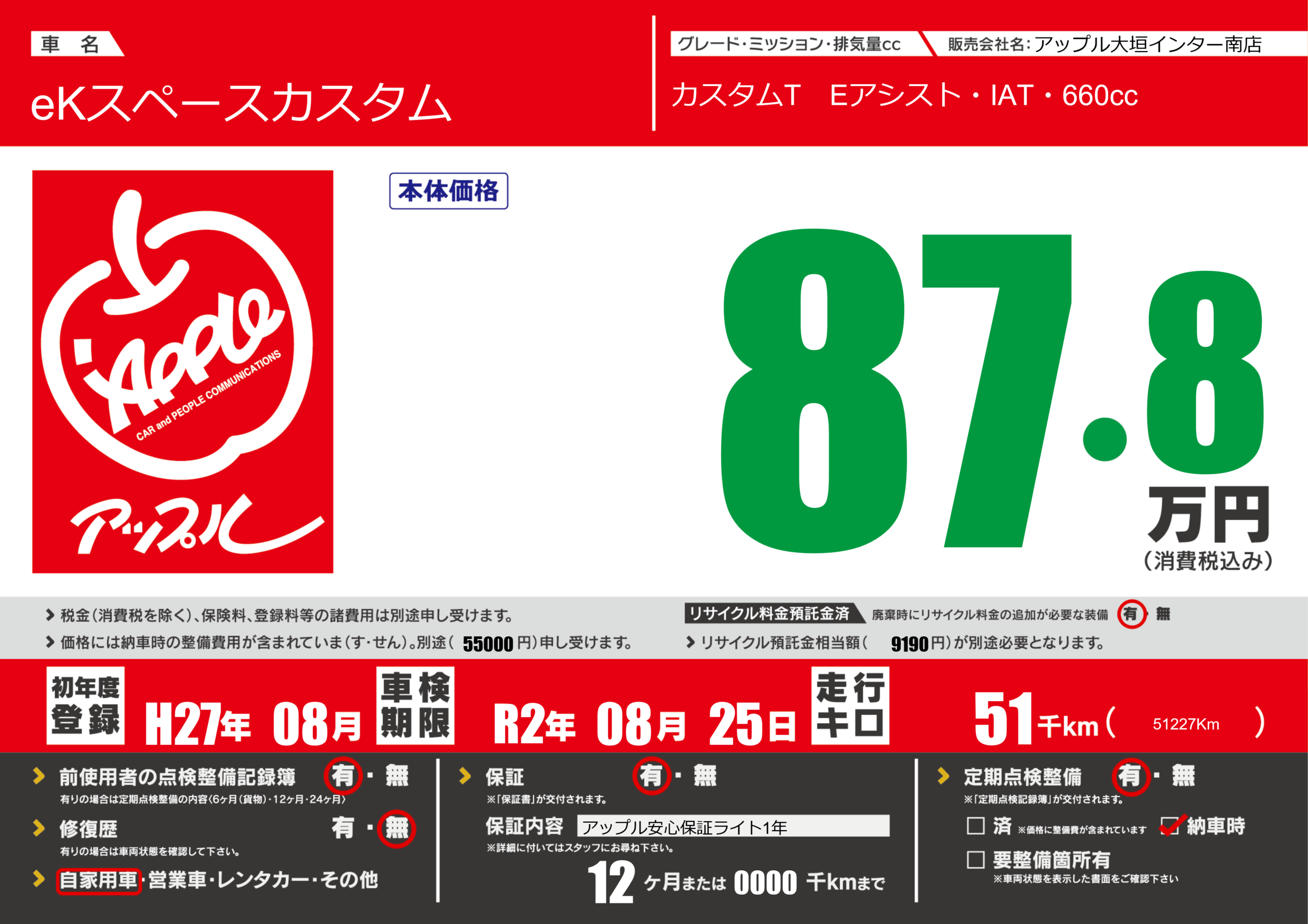 | 定期点検整備 | 定期点検整備あり 納車時あり | ||