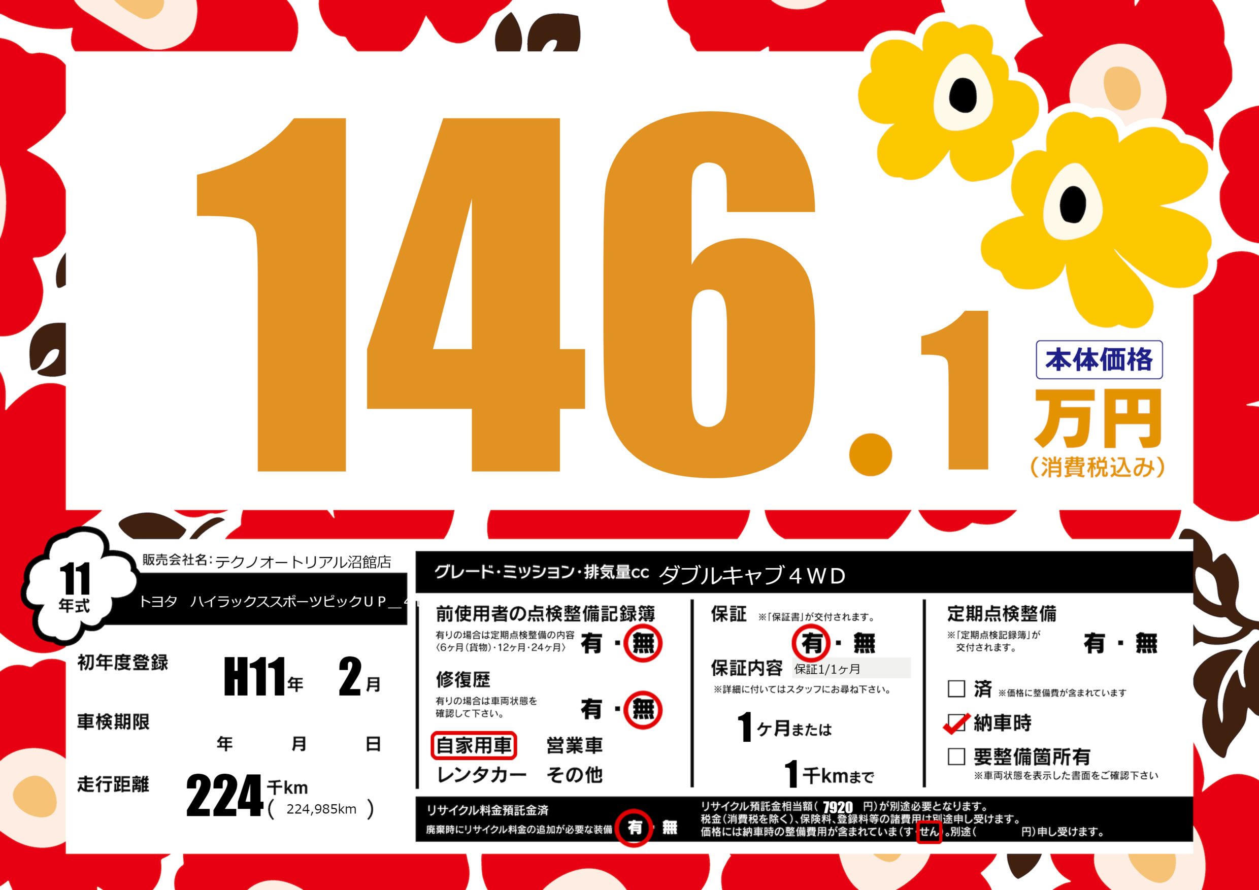 | 走行キロ | 22.4万km | 初年度登録 | H11年2月 |