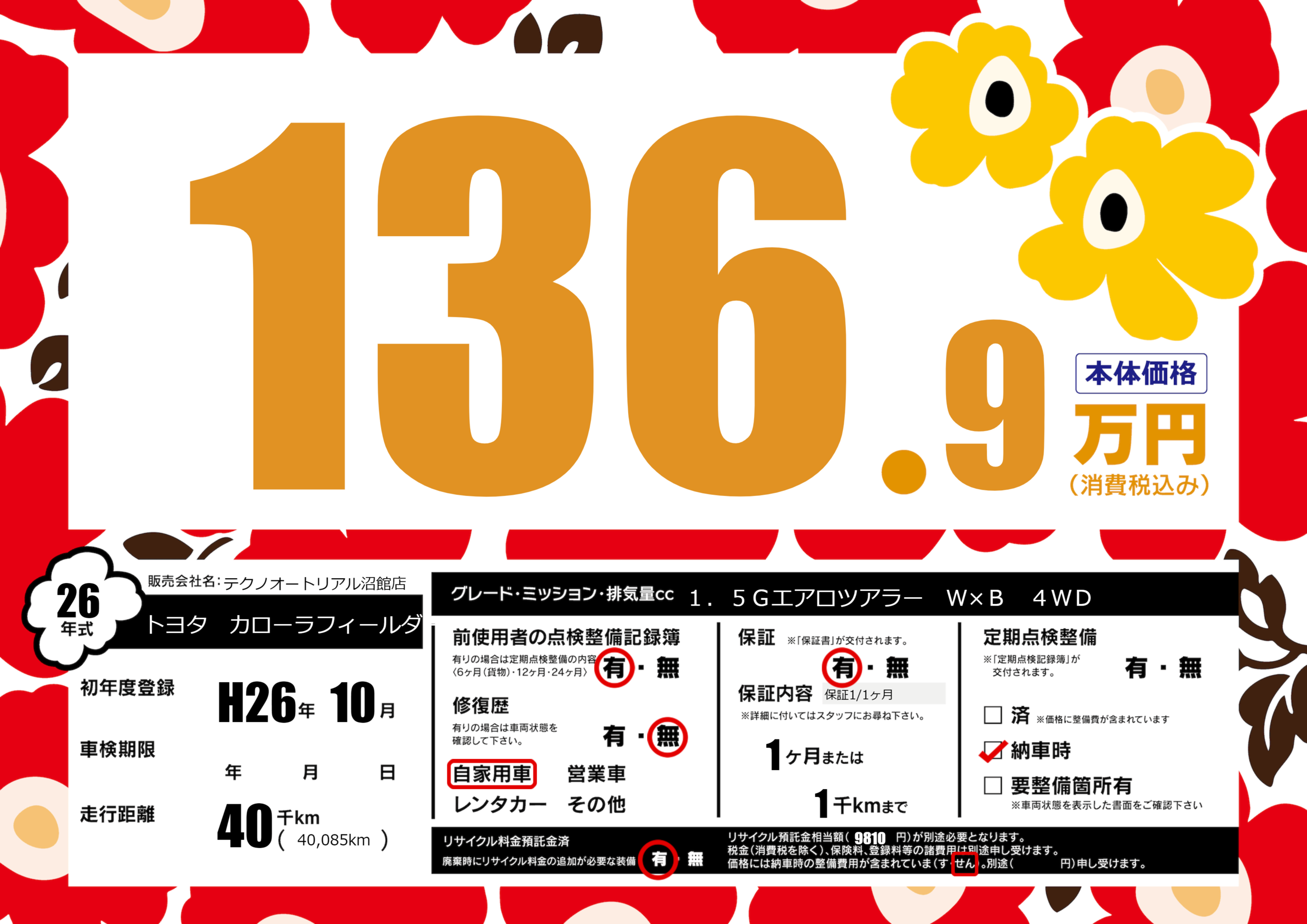 | 走行キロ | 4万km | 初年度登録 | H26年10月 |