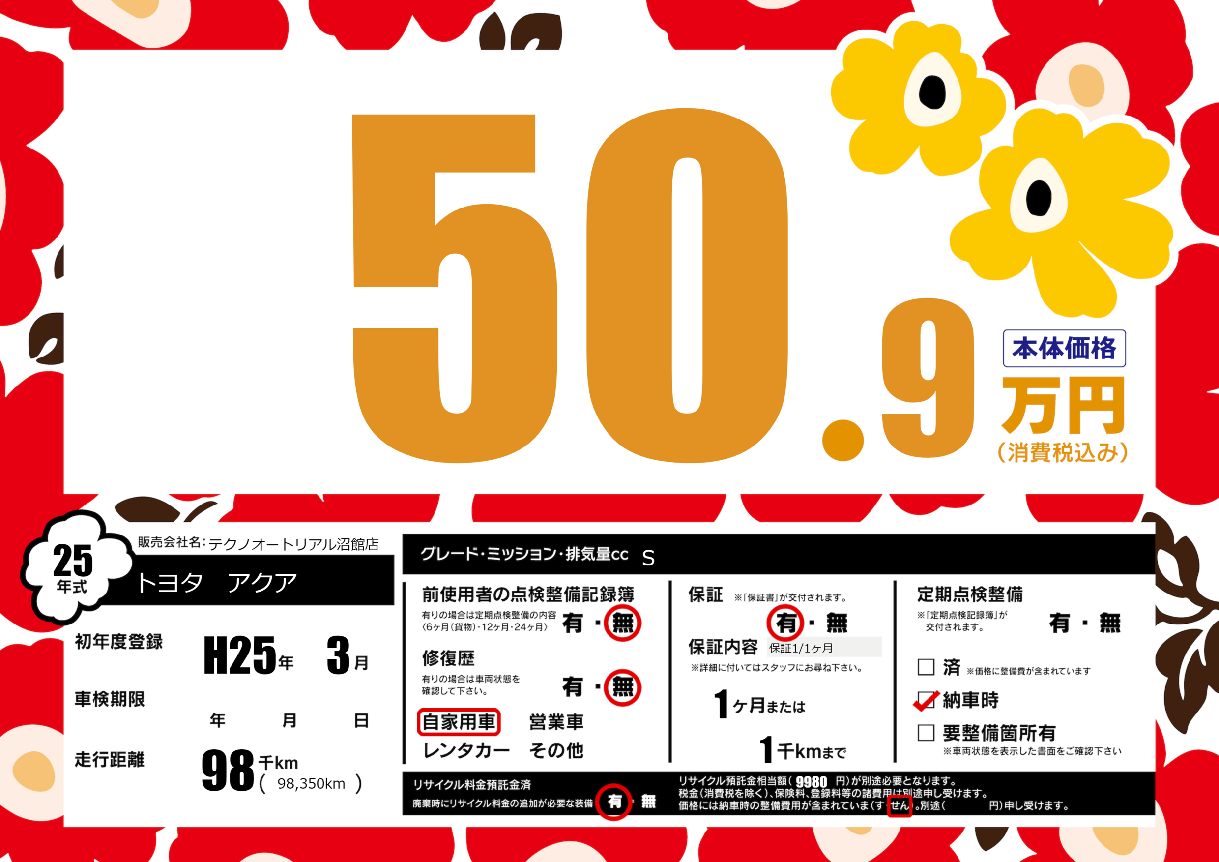 | 車名 | トヨタ アクア | グレード ミッション 排気量 |