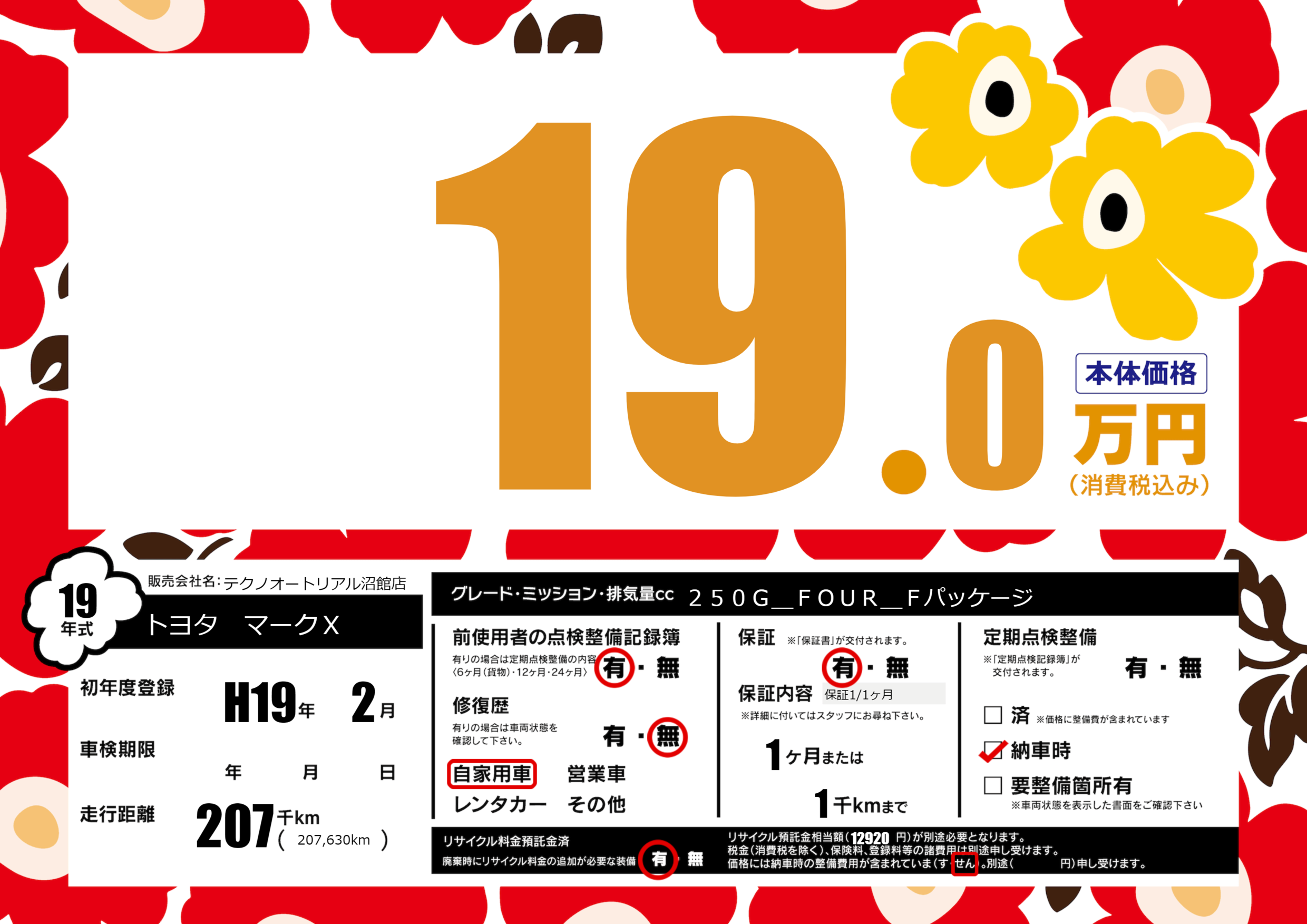 | 車名 | トヨタ マークX | グレード ミッション 排気量 |