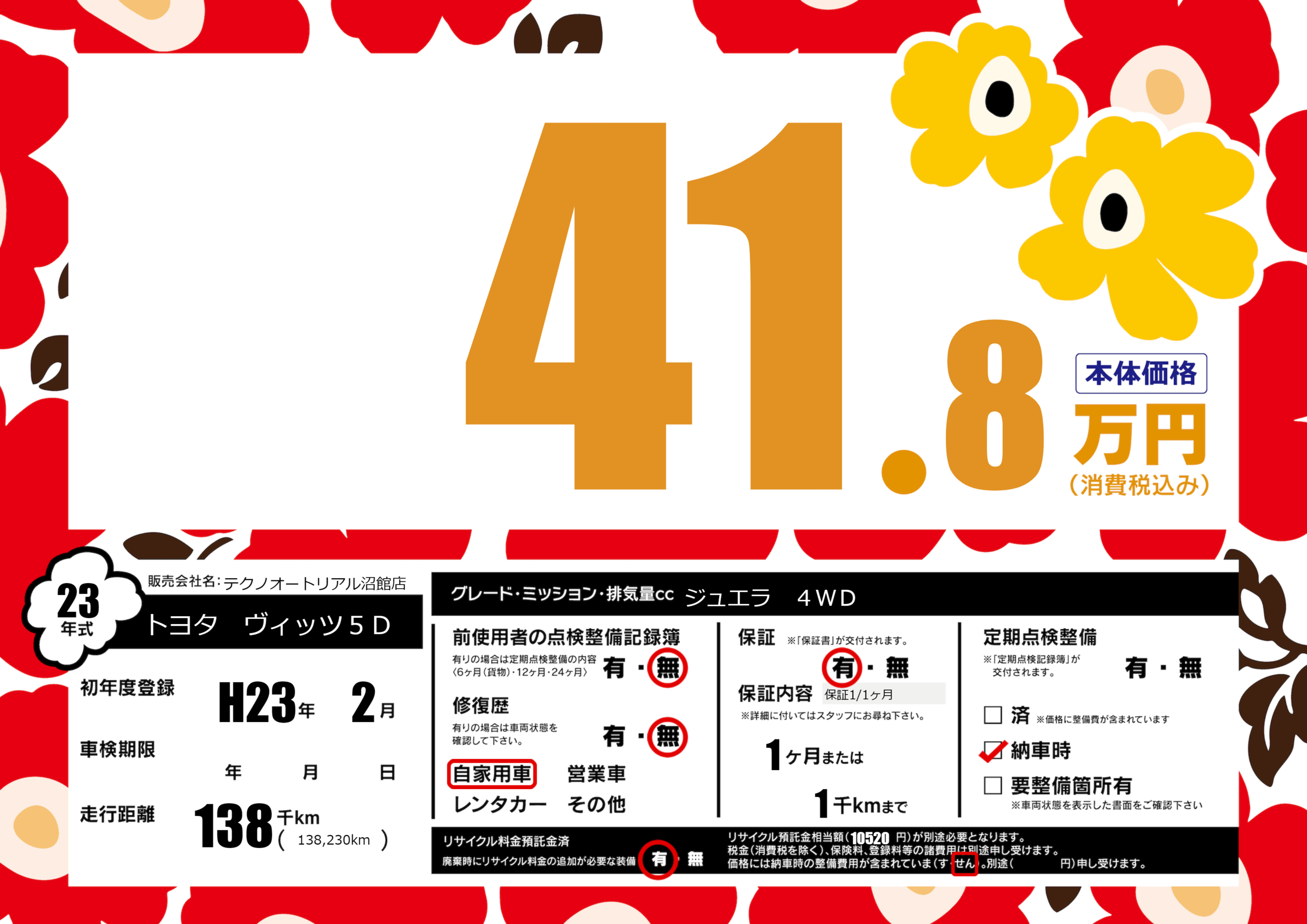 | 走行キロ | 13.8万km | 初年度登録 | H23年2月 |