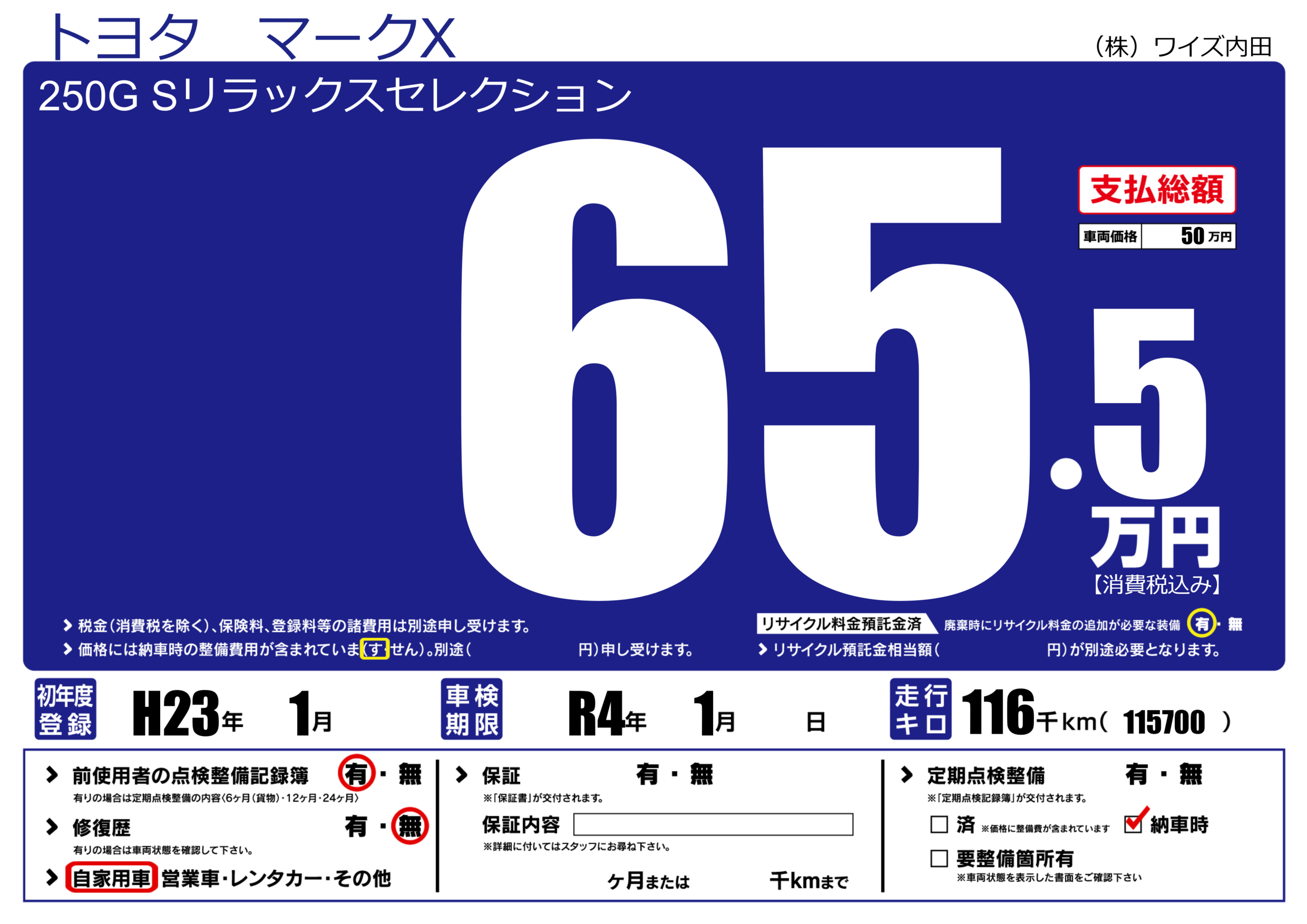| 走行キロ | 11.6万km | 初年度登録 | H23年1月 |