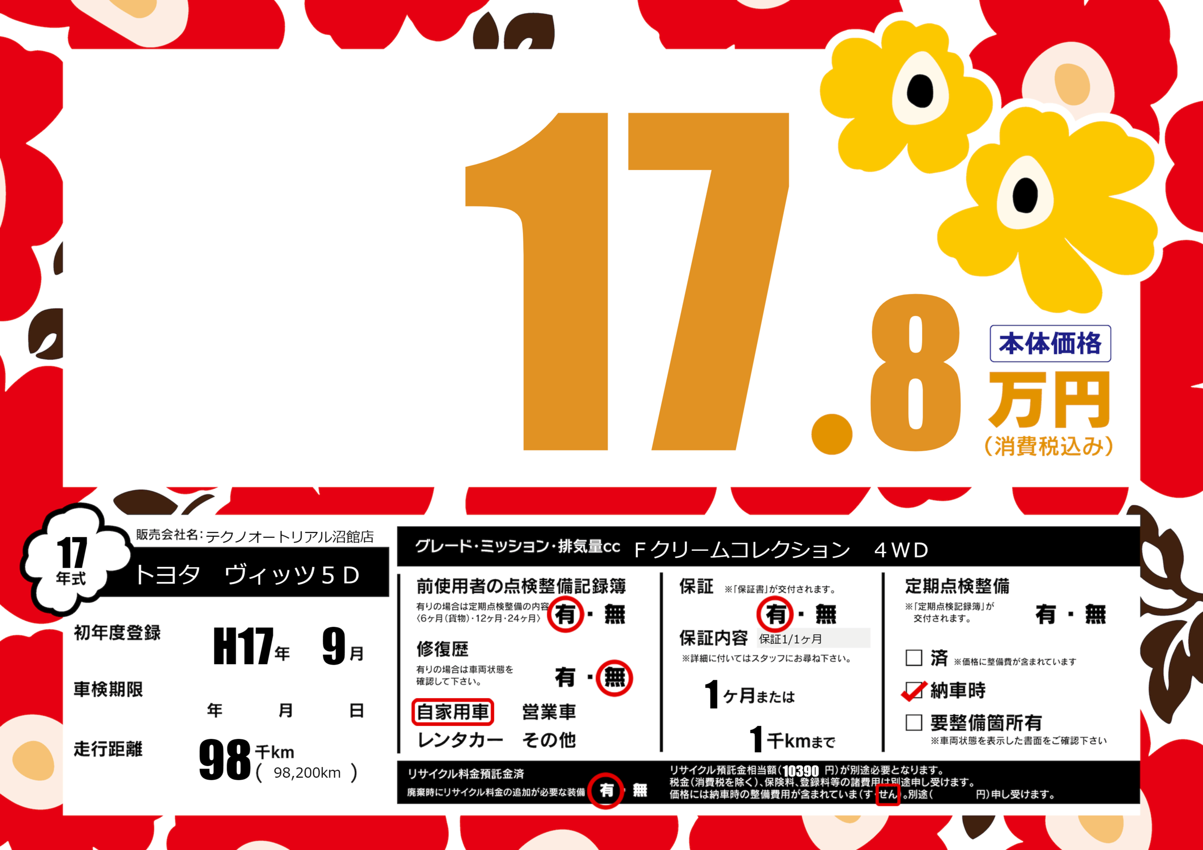 | 車名 | トヨタ ヴィッツ5D | グレード ミッション 排気量 |