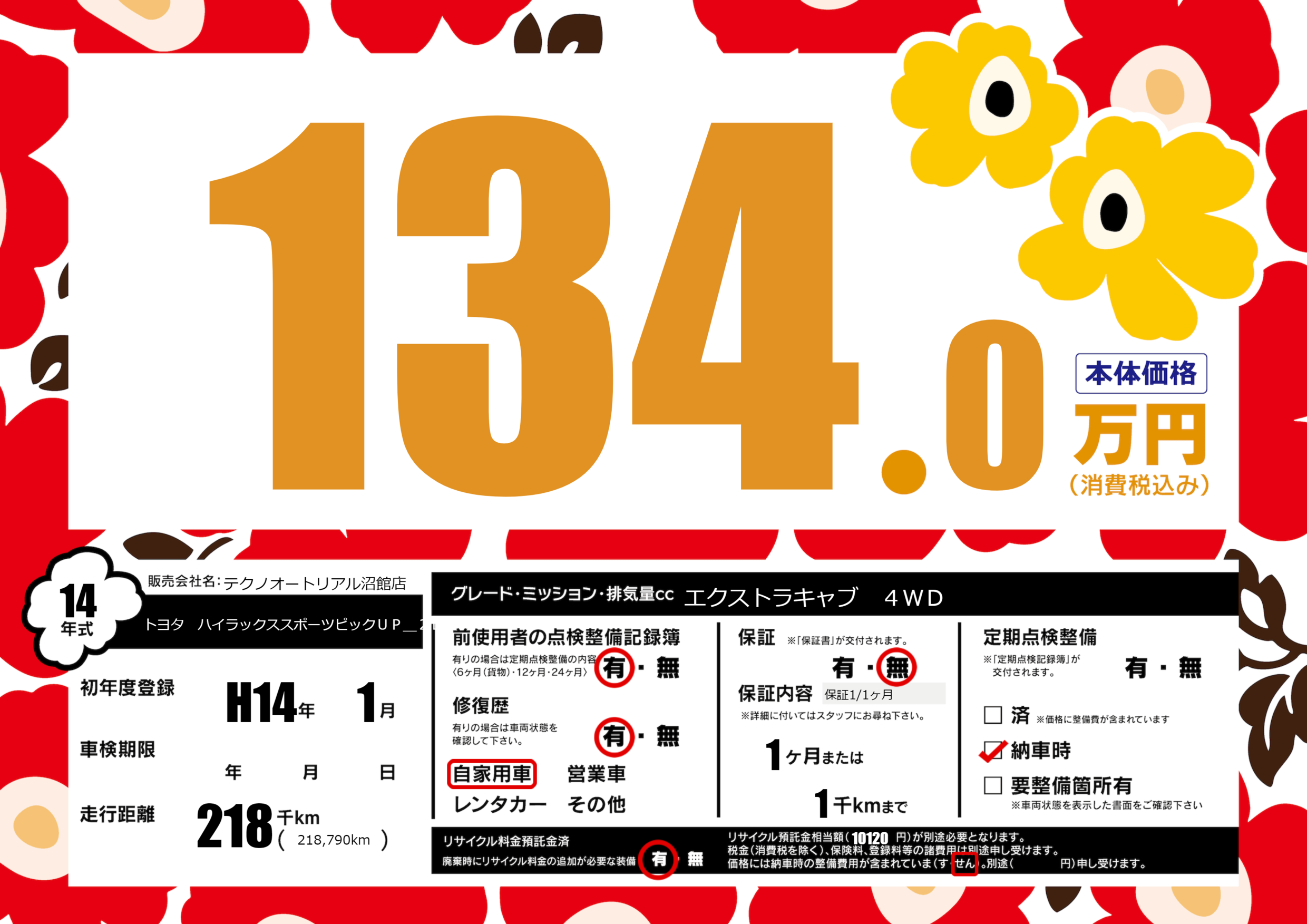 | 走行キロ | 21.8万km | 初年度登録 | H14年1月 |