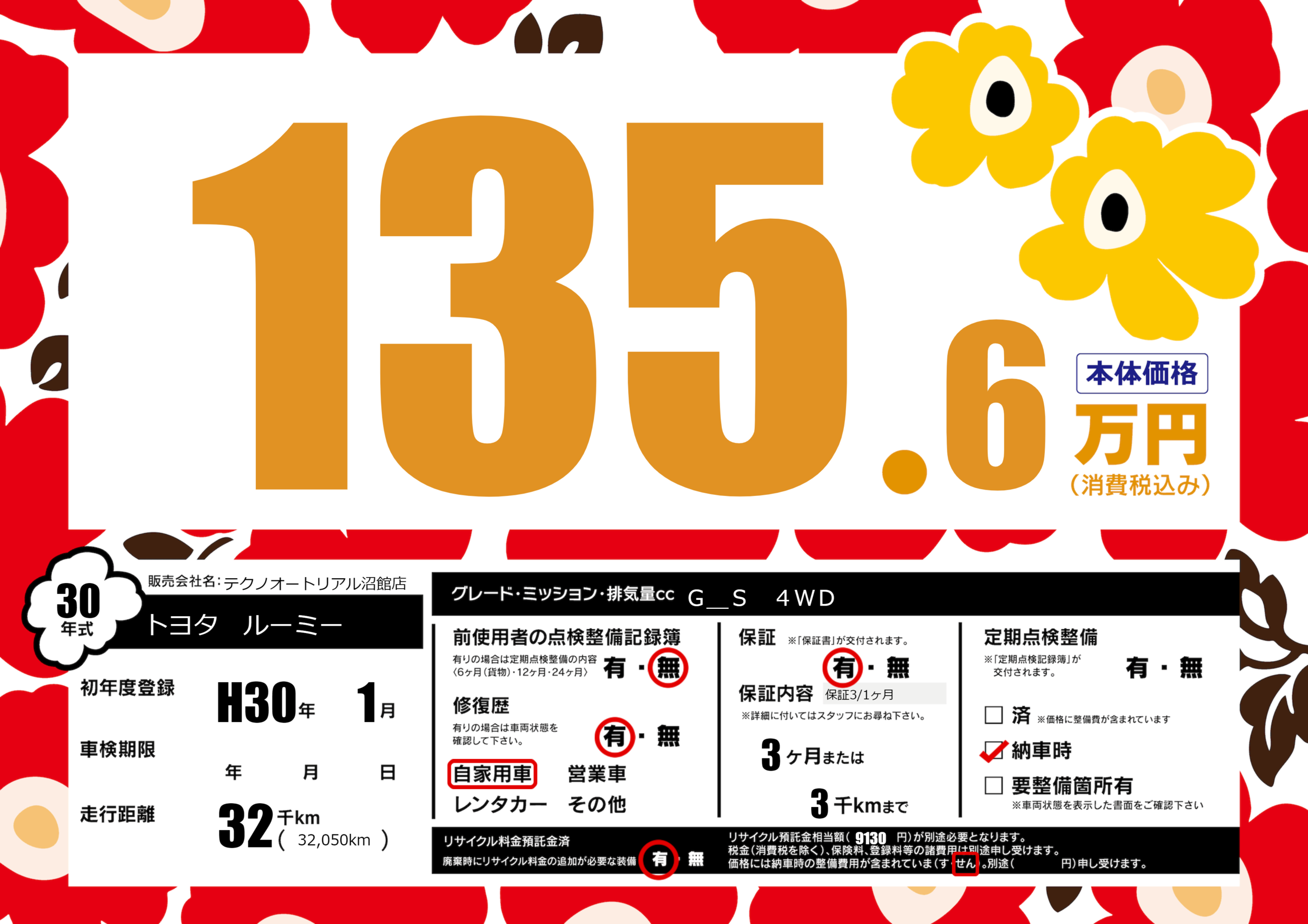 | 車名 | トヨタ ルーミー | グレード ミッション 排気量 |