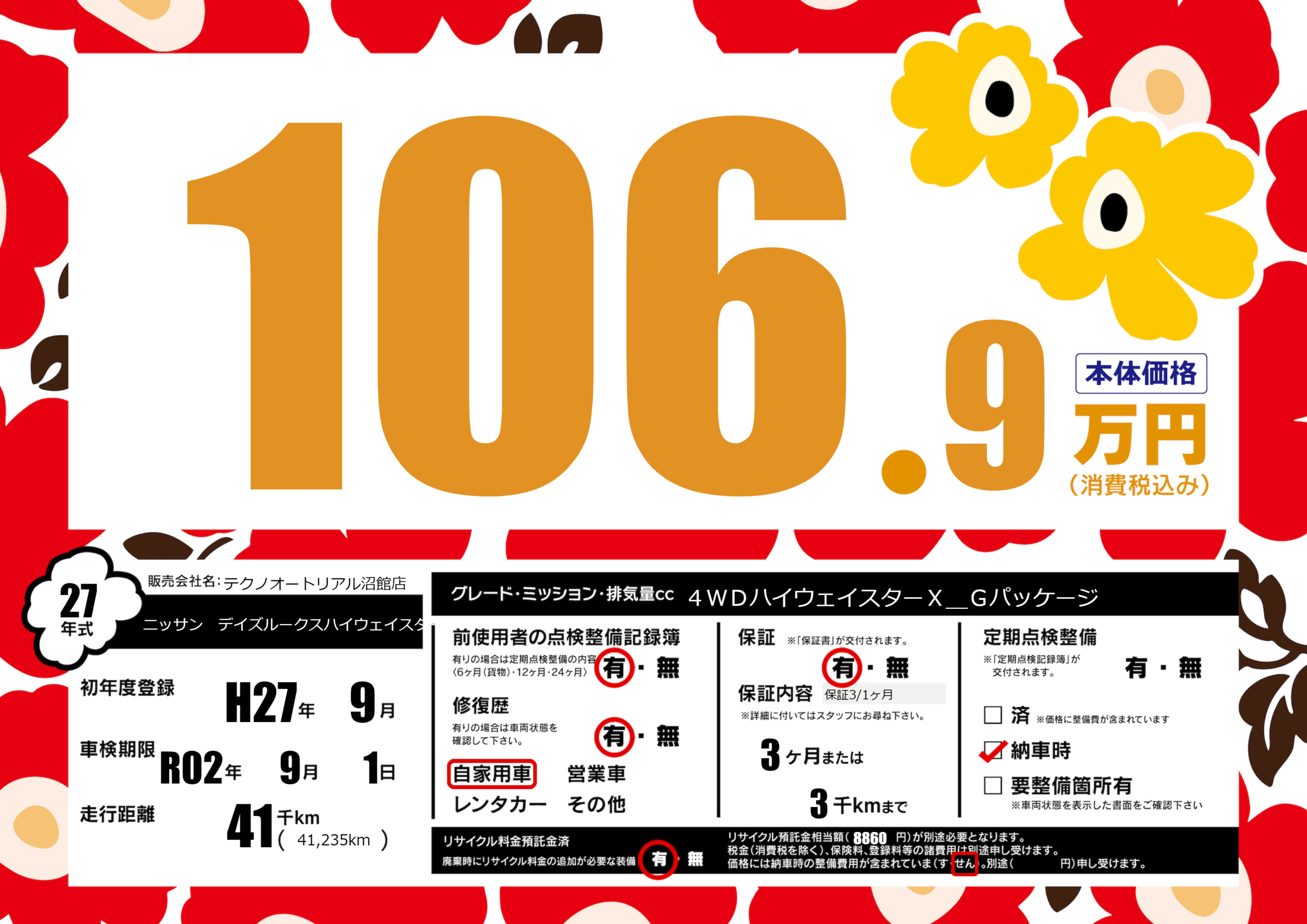 | 車名 | ニッサン デイズルークスハイウェイスター | グレード ミッション 排気量 |