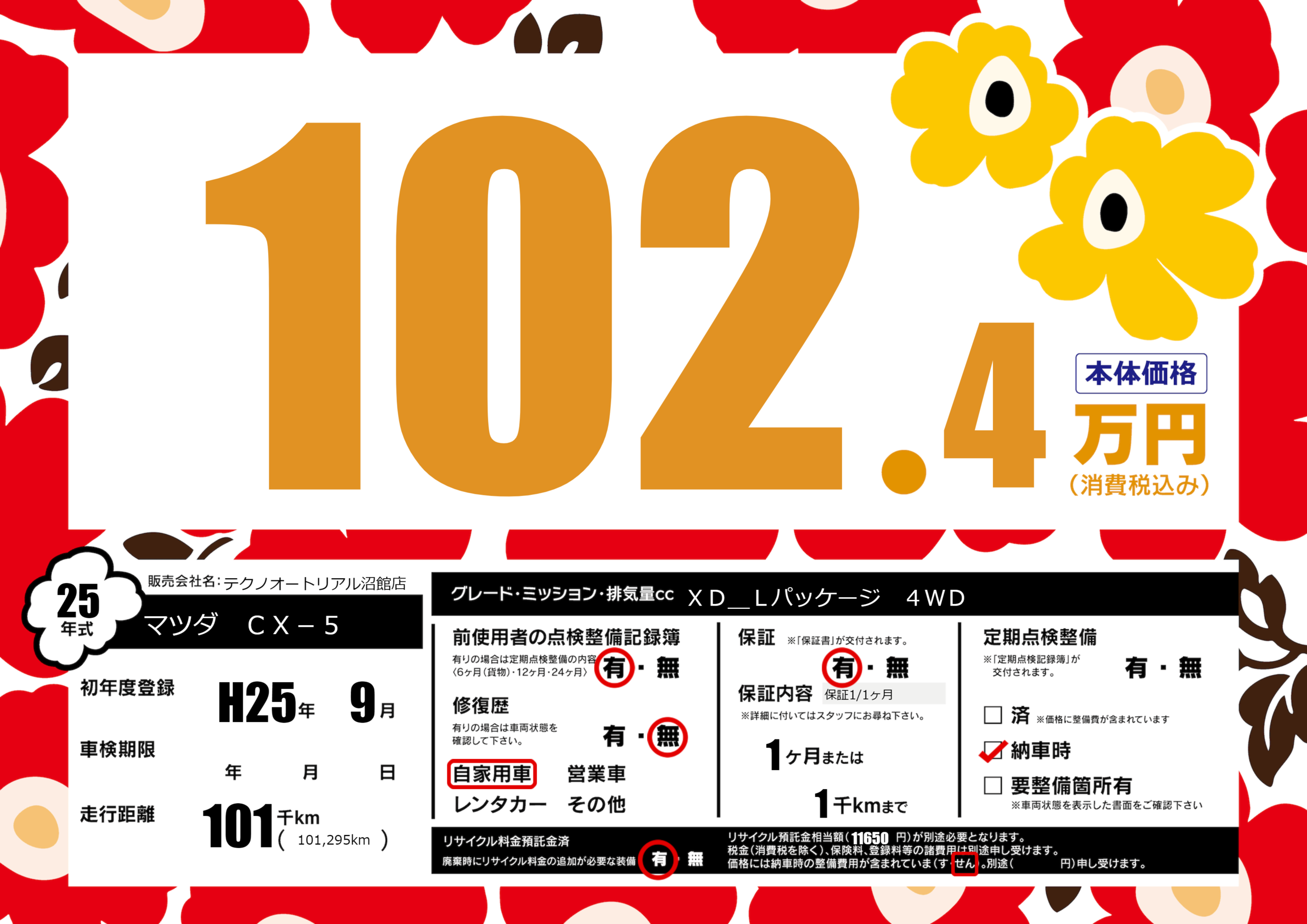 | 車名 | マツダ CX-5 | グレード ミッション 排気量 |