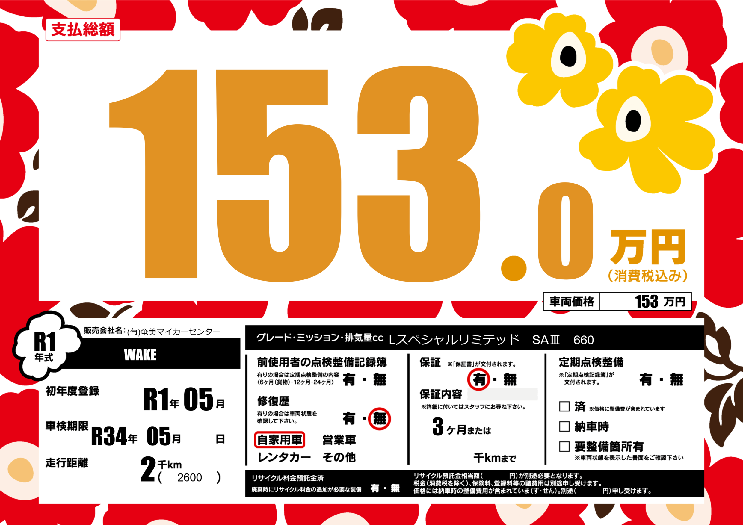 | 車名 | WAKE | グレード ミッション 排気量 |