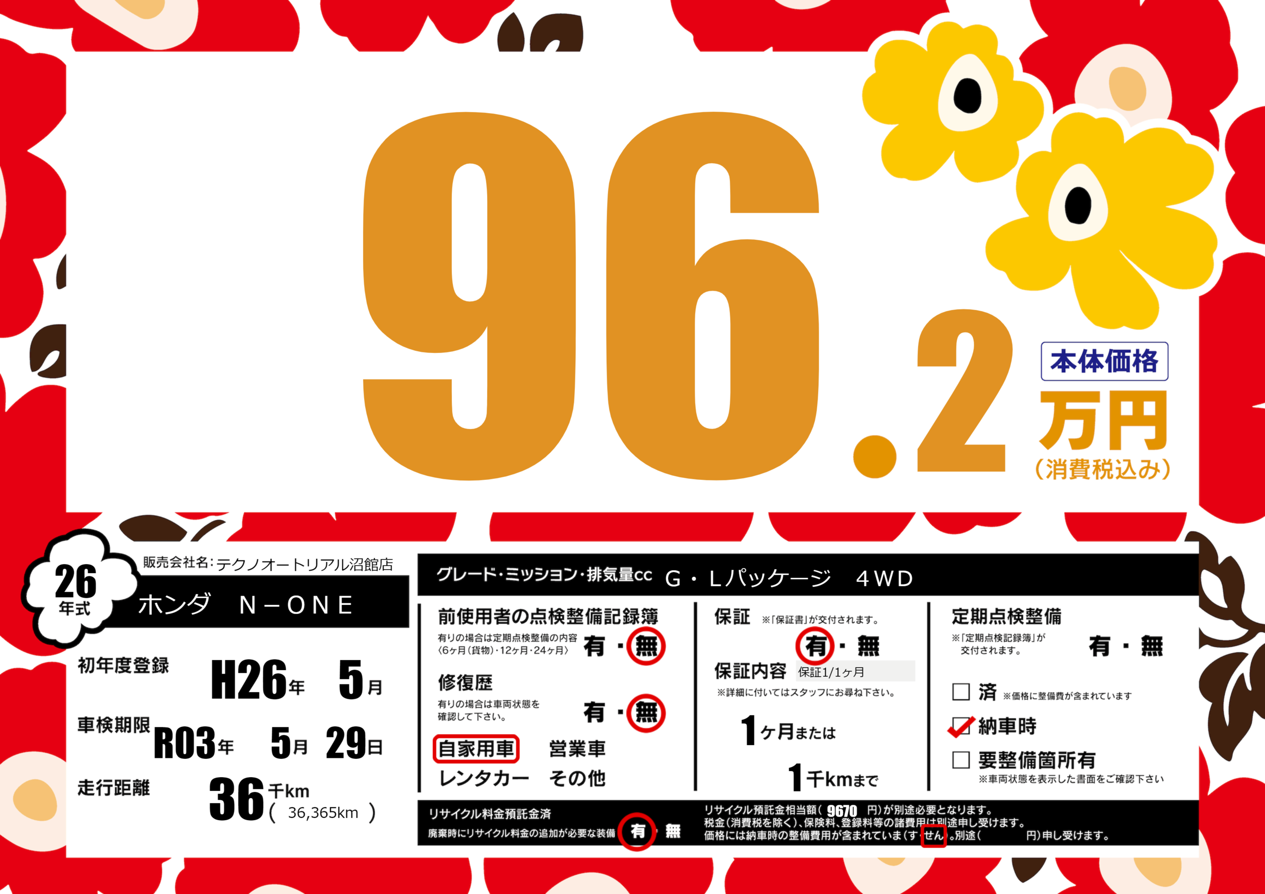 | 車名 | ホンダ N-ONE | グレード ミッション 排気量 |